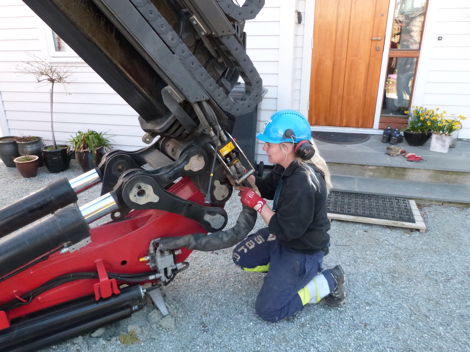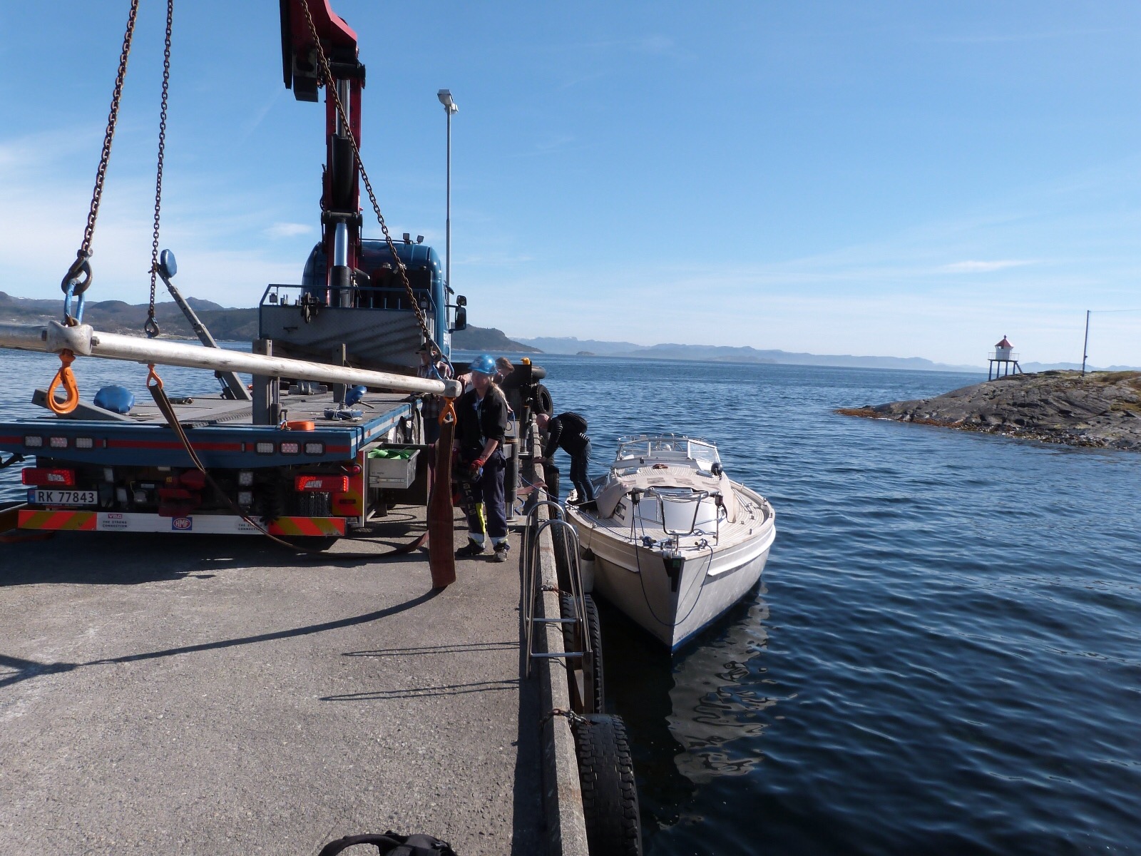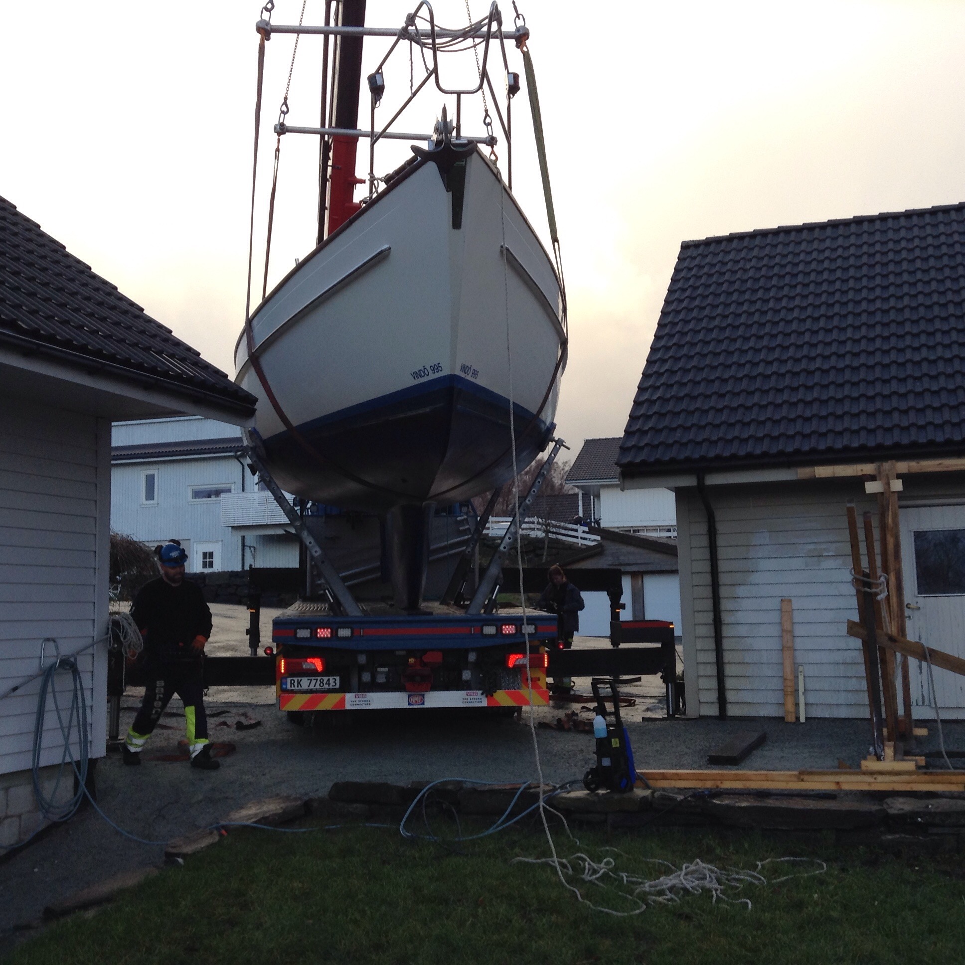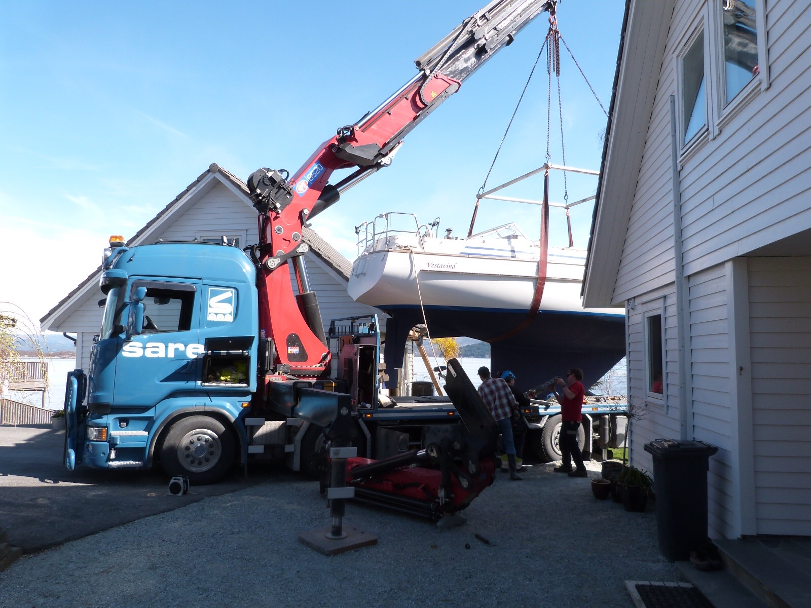 Eventually, Monday 20th of April, the big truck came, with driver Linda, and safely put Vestavind back where she belongs. It was tight and the job took about three hours, but everything went well. The engine started at first go and the new propeller also worked fine. More testing will be carried out later. Thanks to Jostein and Benjamin for good help!