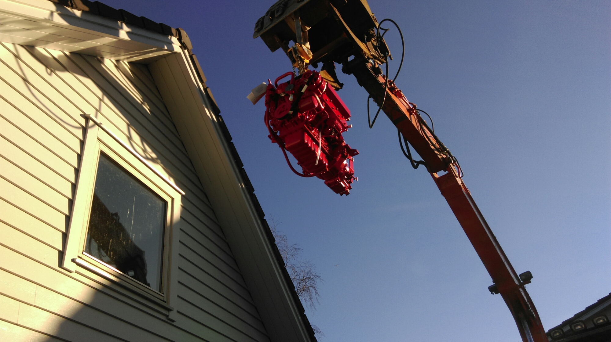 We lifted out the old engine, using an excavater and a chain pulley. It was an easy and quick job. When I had taken off the gear box, it came out nicely through the hatch.