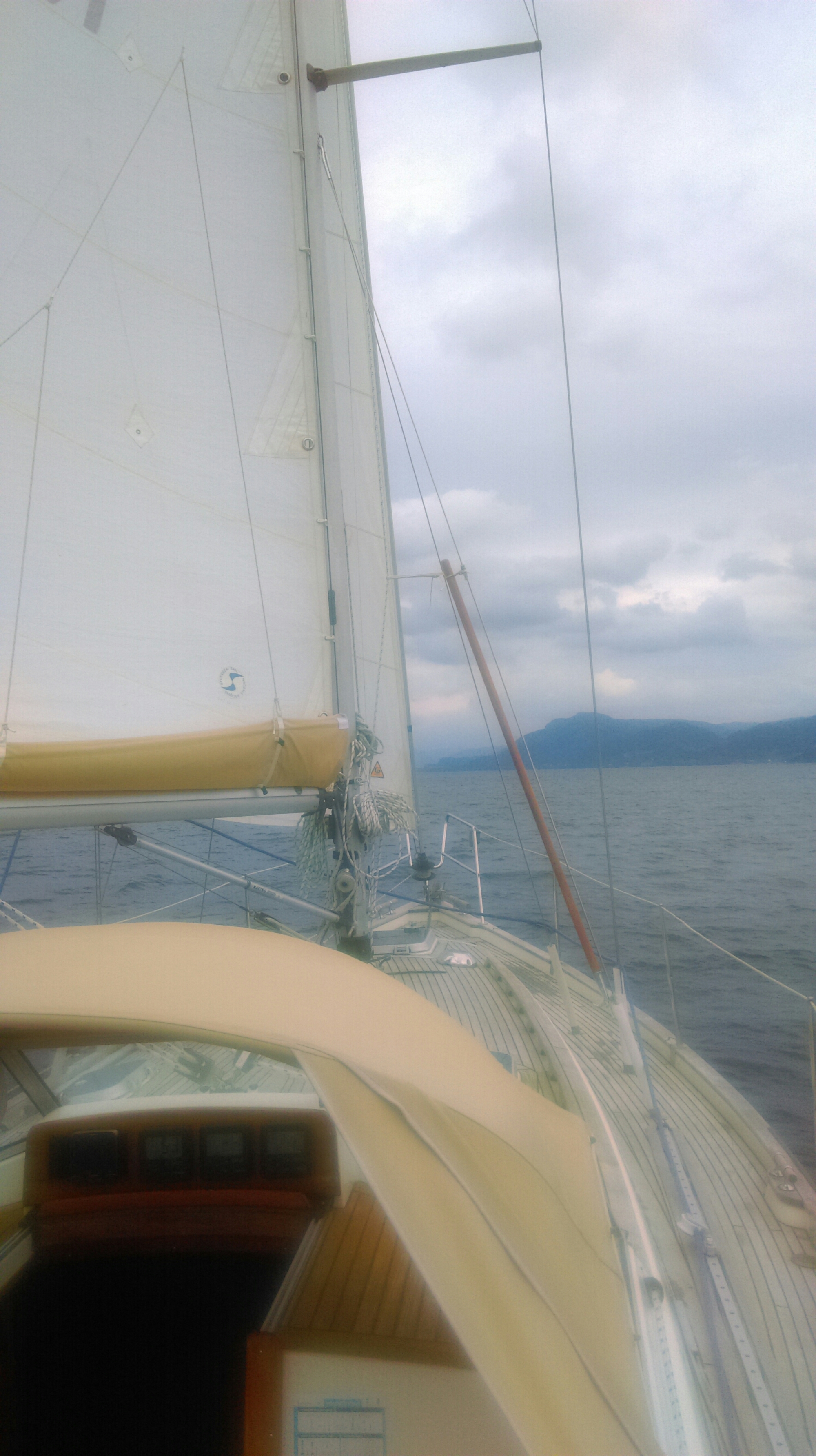 Reaching in a good SE breeze. Both sails, 6-7 knots. Wonderful!