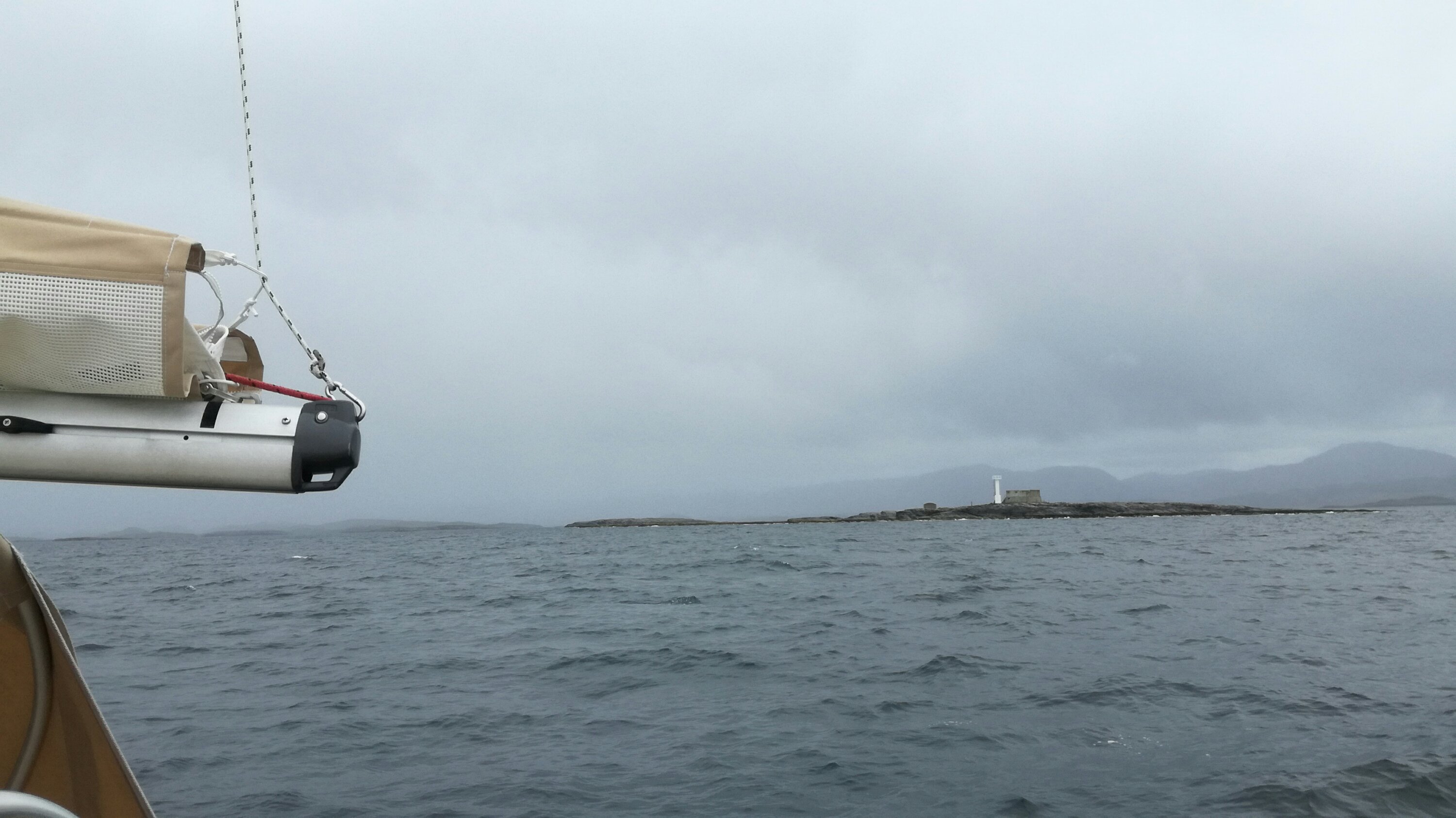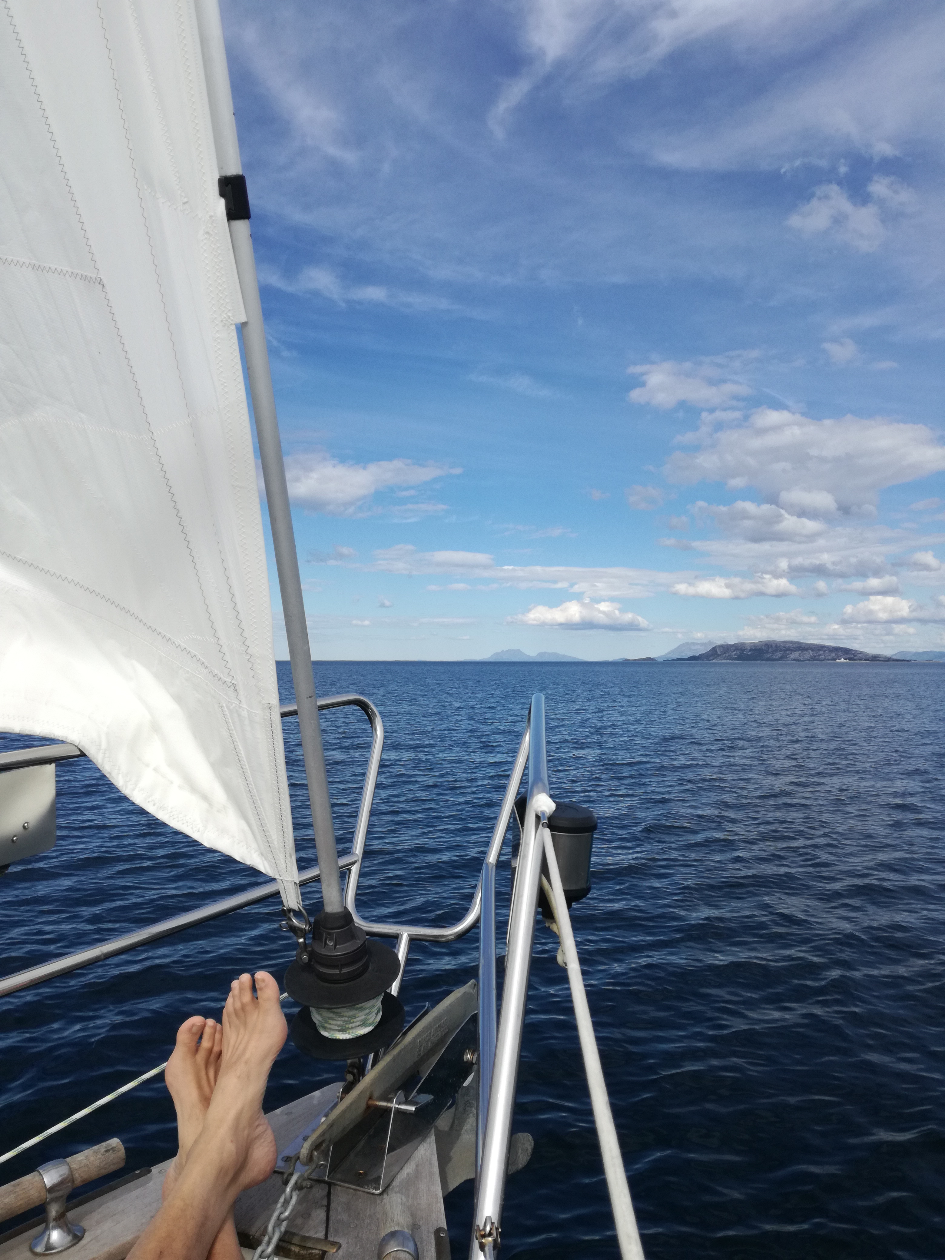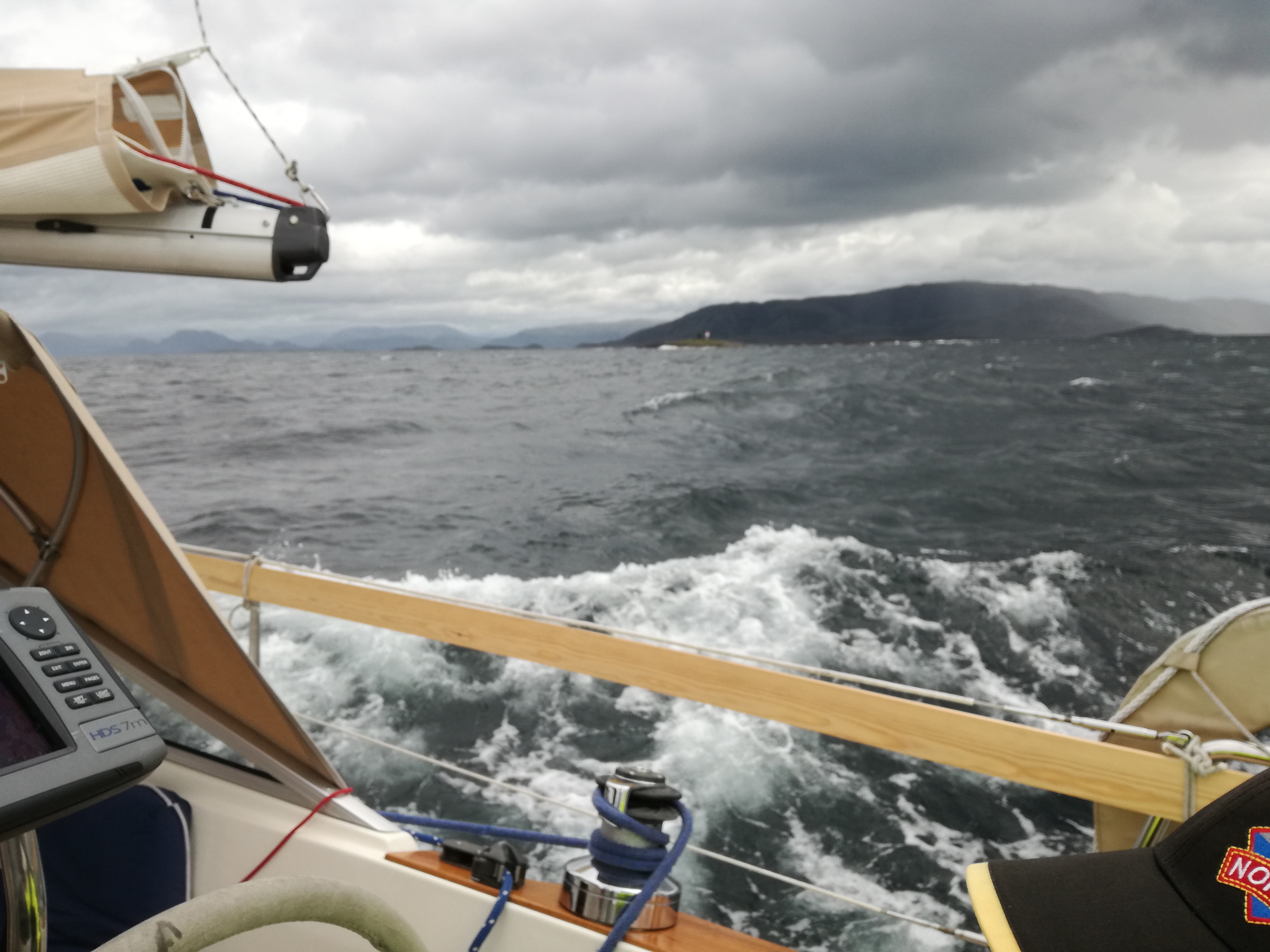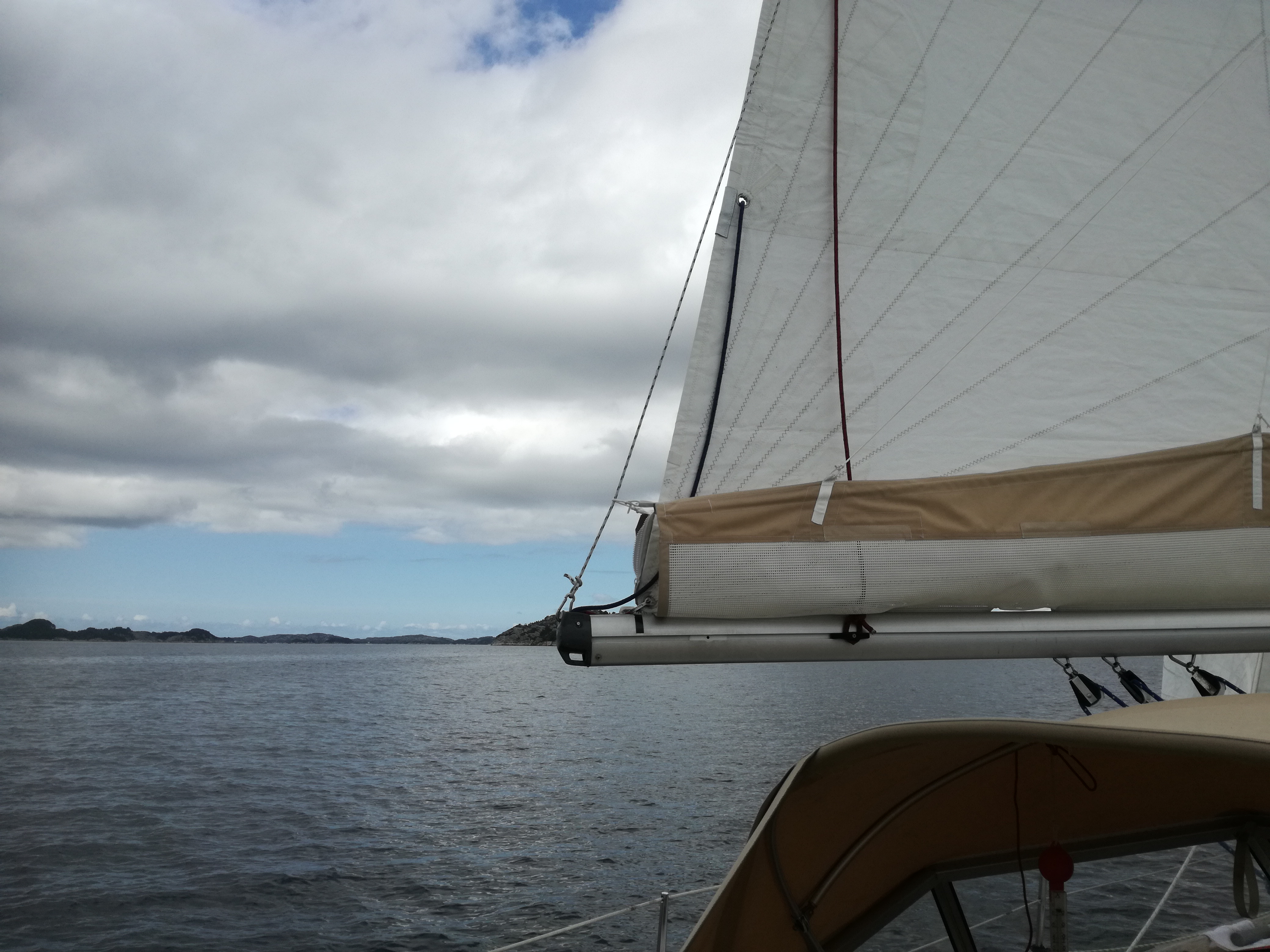 We planned to sail across to the main land and find a harbour there for the night. But the wind was better suited for sailing on north across the Folla, so we aimed at Sør-Gjeslingan. That would take us until next morning.