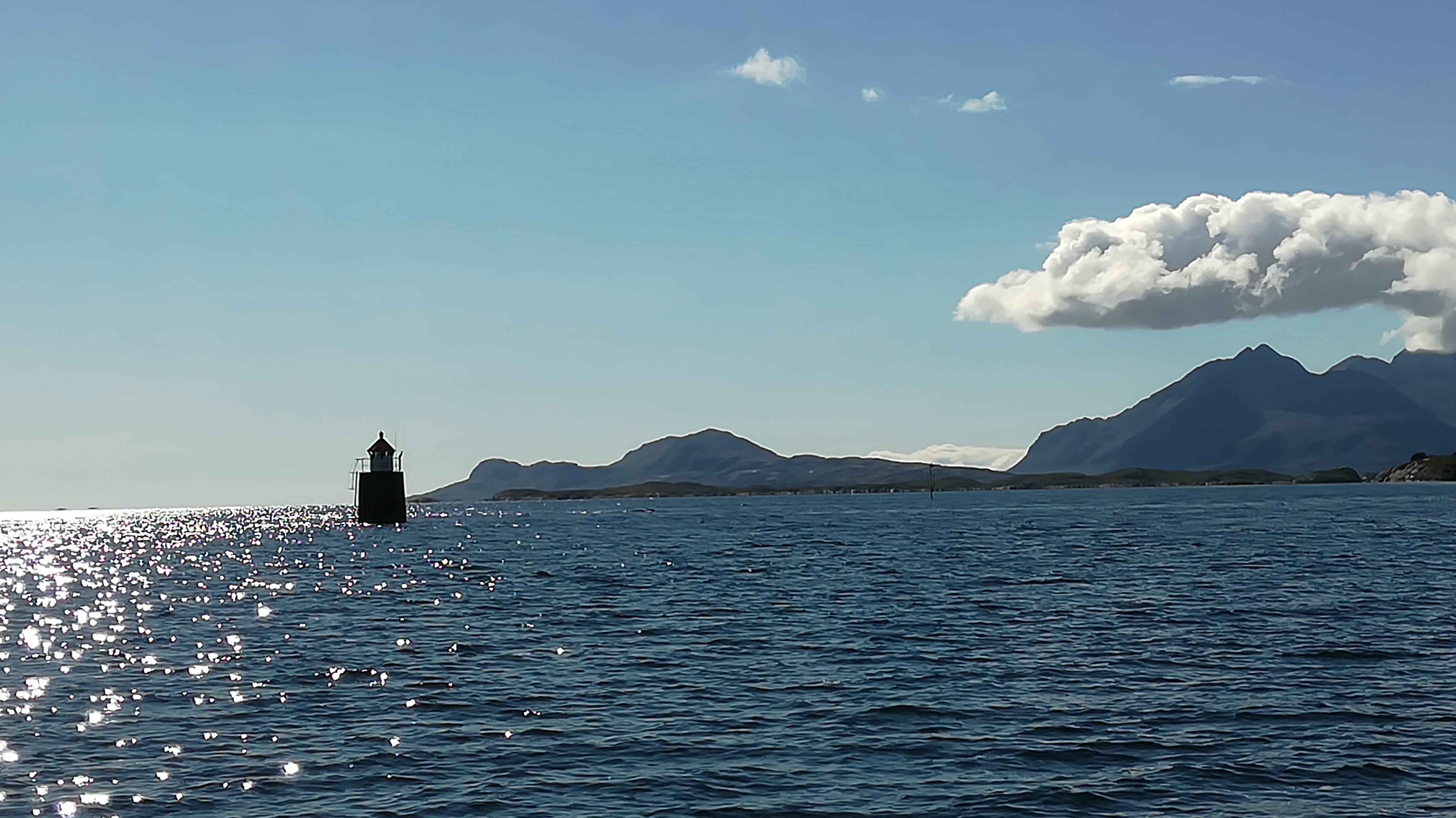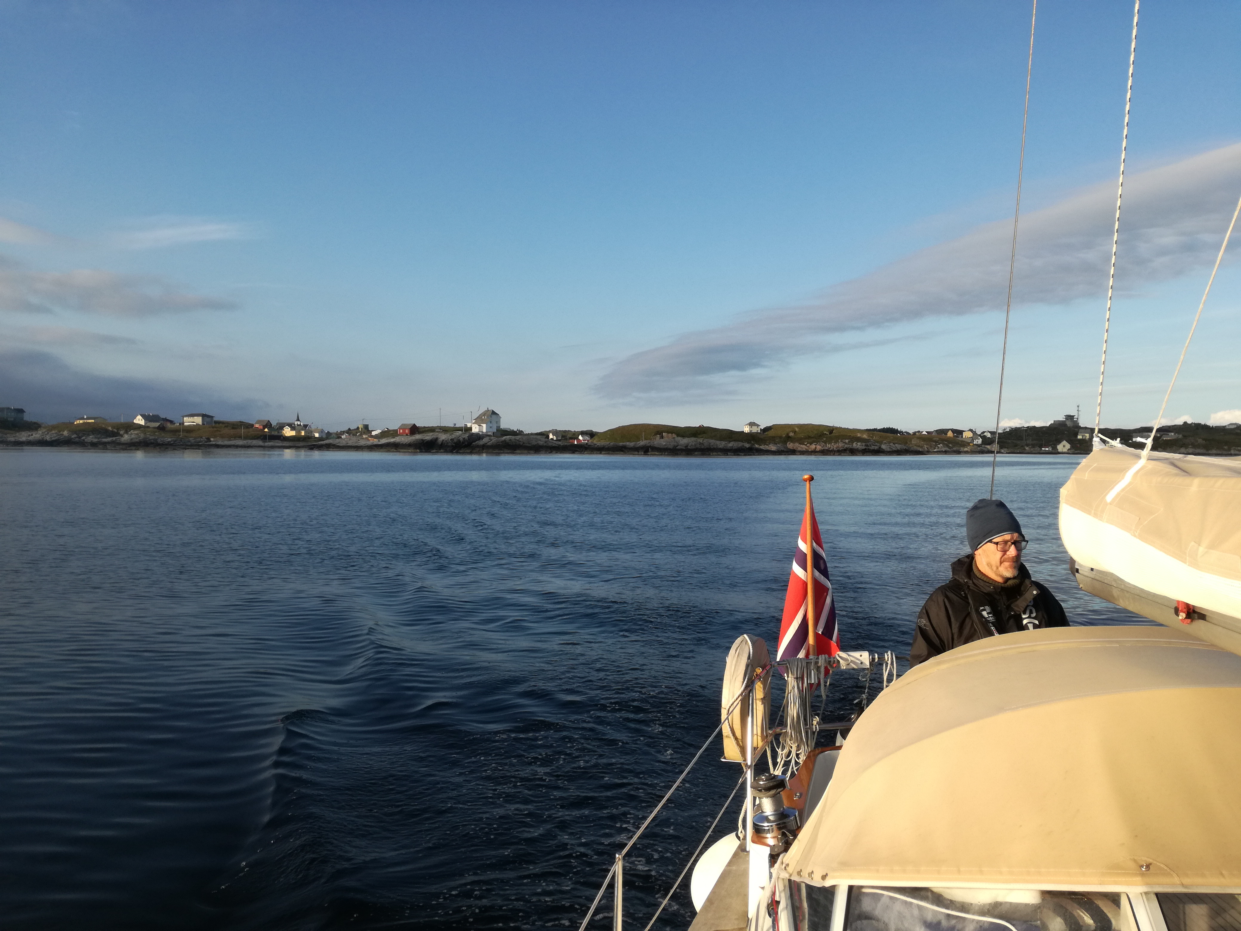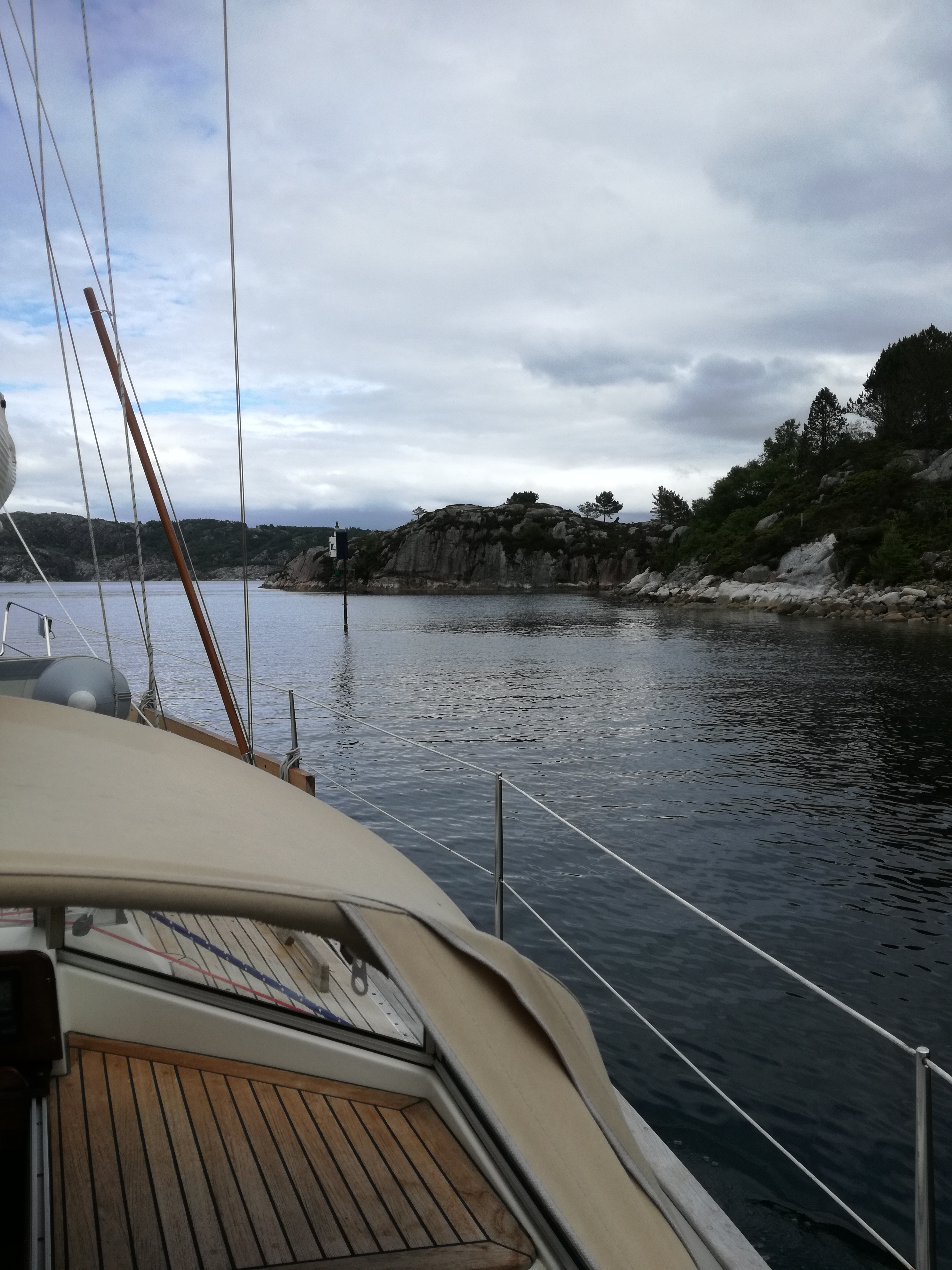 We left Veiholmen early, at 06.30, through a narrow channel to the north east. It is well marked, as are all the common and less common seaways along the coast. Having an old skipper on board has been very interesting and helpful, and good company. I learn a lot about coastal navigation. And hear many stories from his almost 65 years at sea. He started with his father when he was 15 with local traffic along the west coast of Norway, and took part in herring fisheries north of Iceland when he was 18.