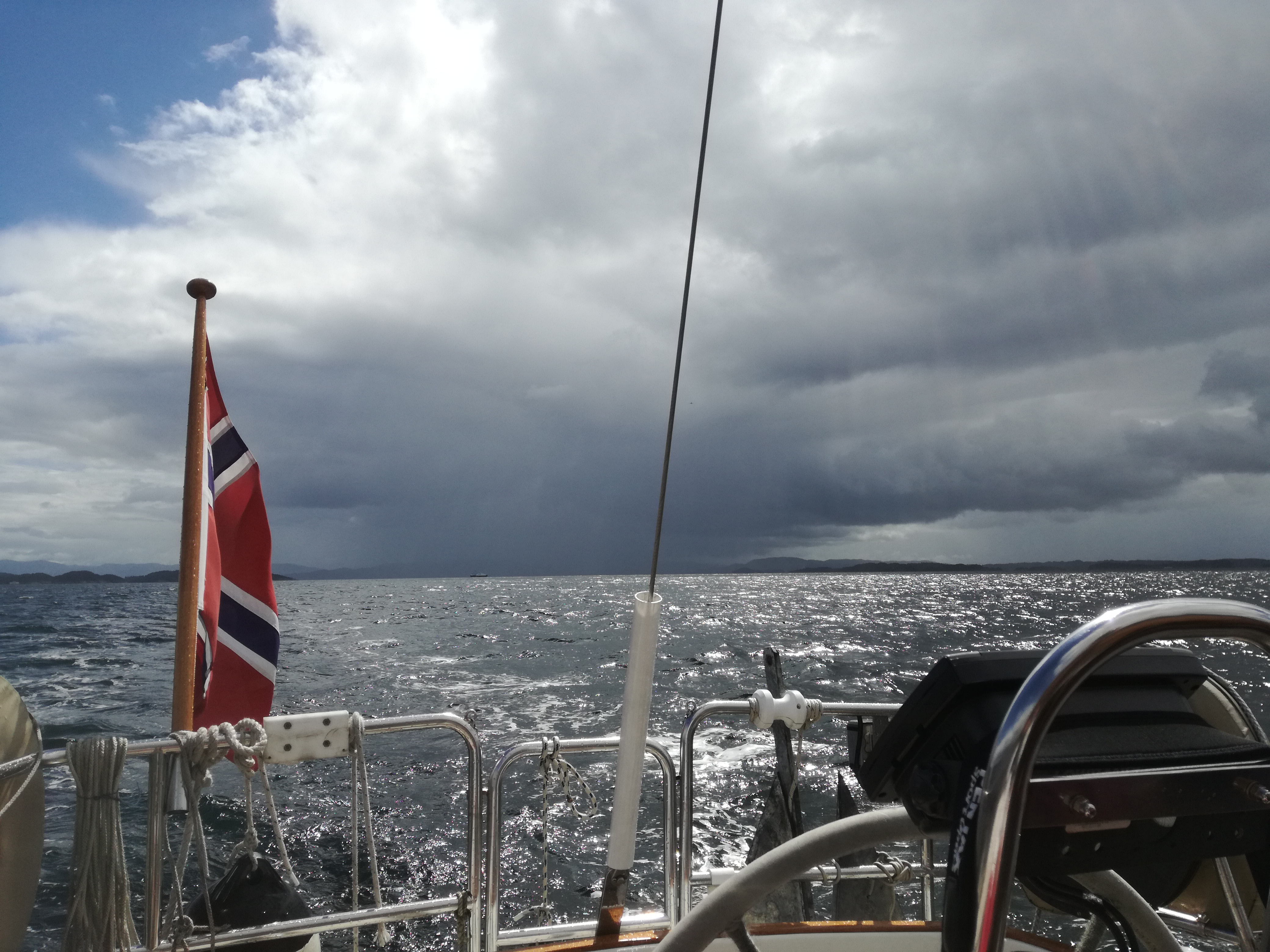 Latest report: safely moored at Sandsøy, north of Stadt. Wind: gale up to 25 knots, waves: 4-5 meters. The boat behaved perfectly. They had sailed with the deep reefed main only, 6-7 knots. Well done!