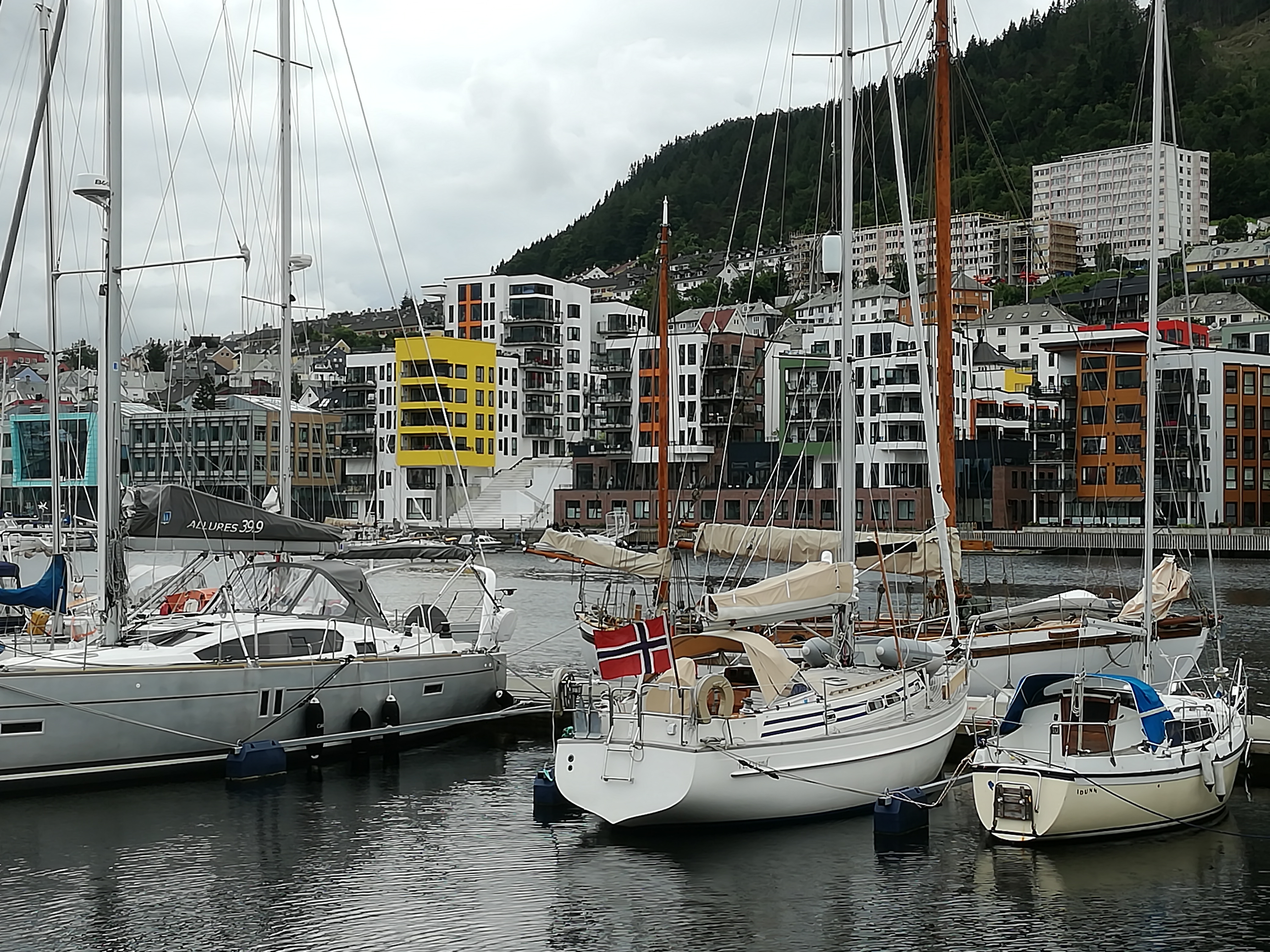 After a pleasant evening in Os with old friends Marit and Arthur, we waited next morning for the rain to pass. There was still a strong breeze, gusting to gale, when we continued north to Bergen. This took us six hours against the wind and the tide (it doesn’t show on the pictures!). Since we were here three years ago, a bridge had been built across the entrance to the visitors’ marina, so we had to wait for it to open.