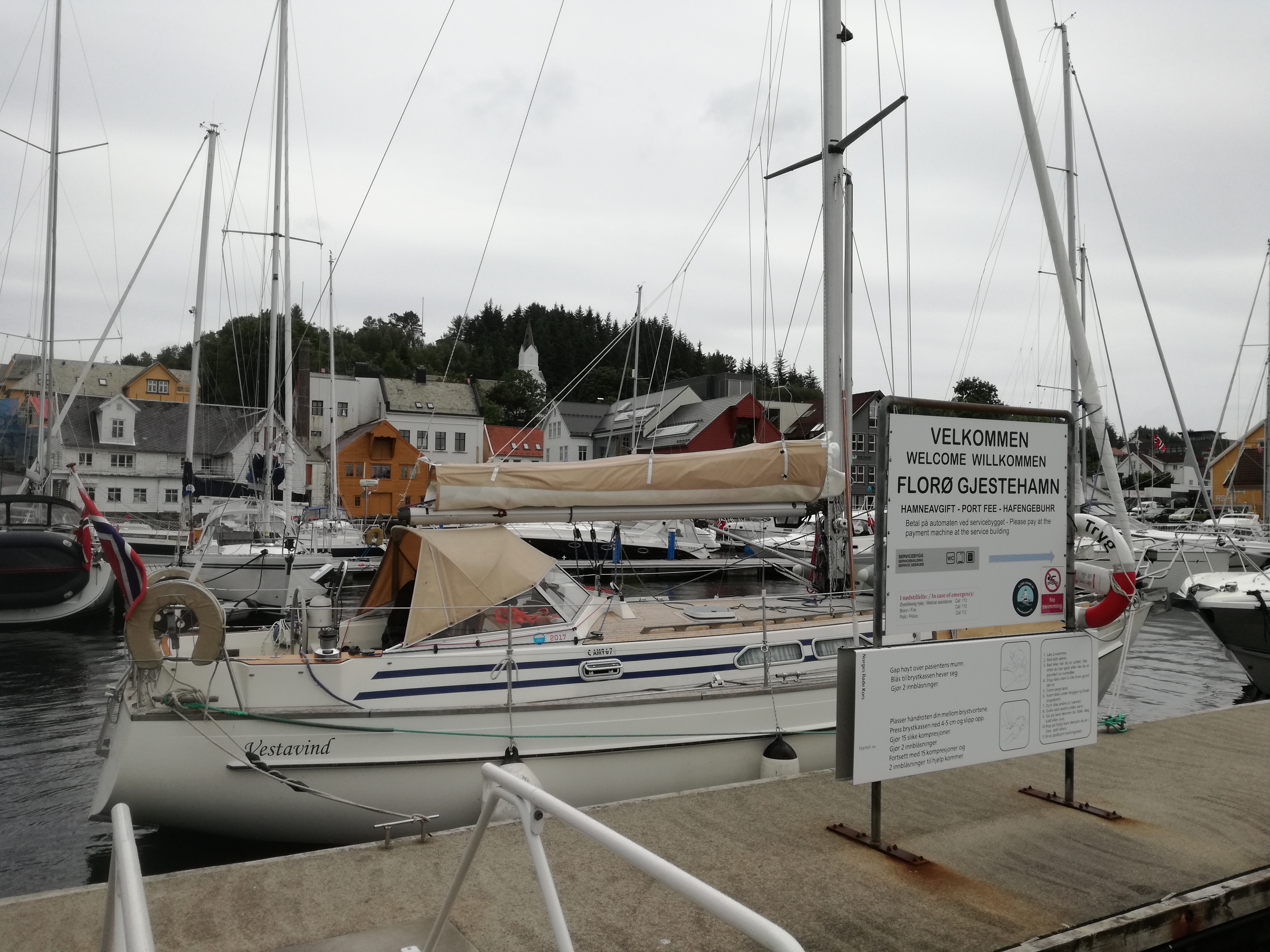 Out of Bergen harbour 14.45 in beautiful sunshine, but little wind. Motored two hours, then sailed for two hours until the wind died. Before we started the engine again, we had finner onboard. Moored at Fedje at 21.00, where we were well received by the harbour master.