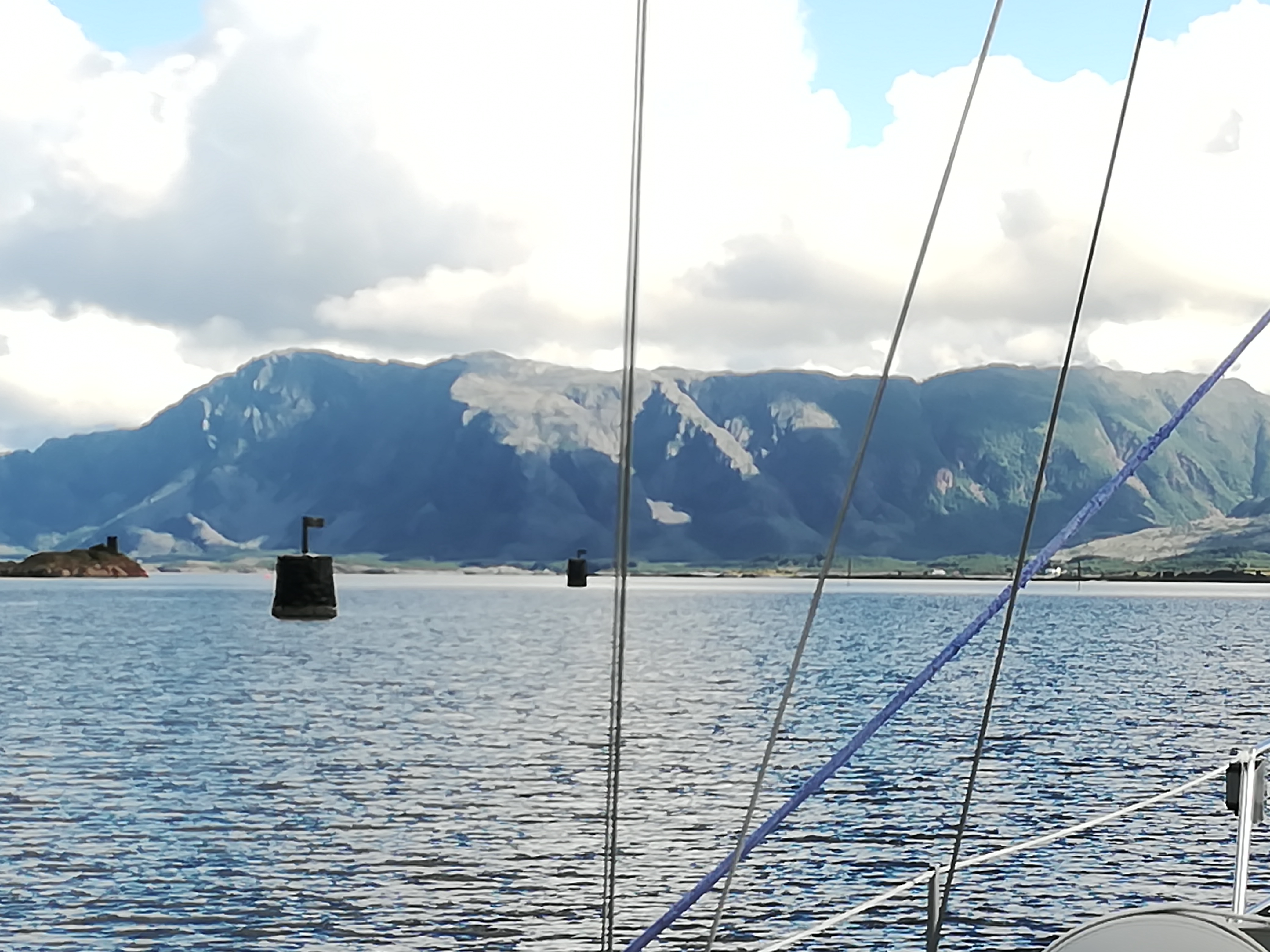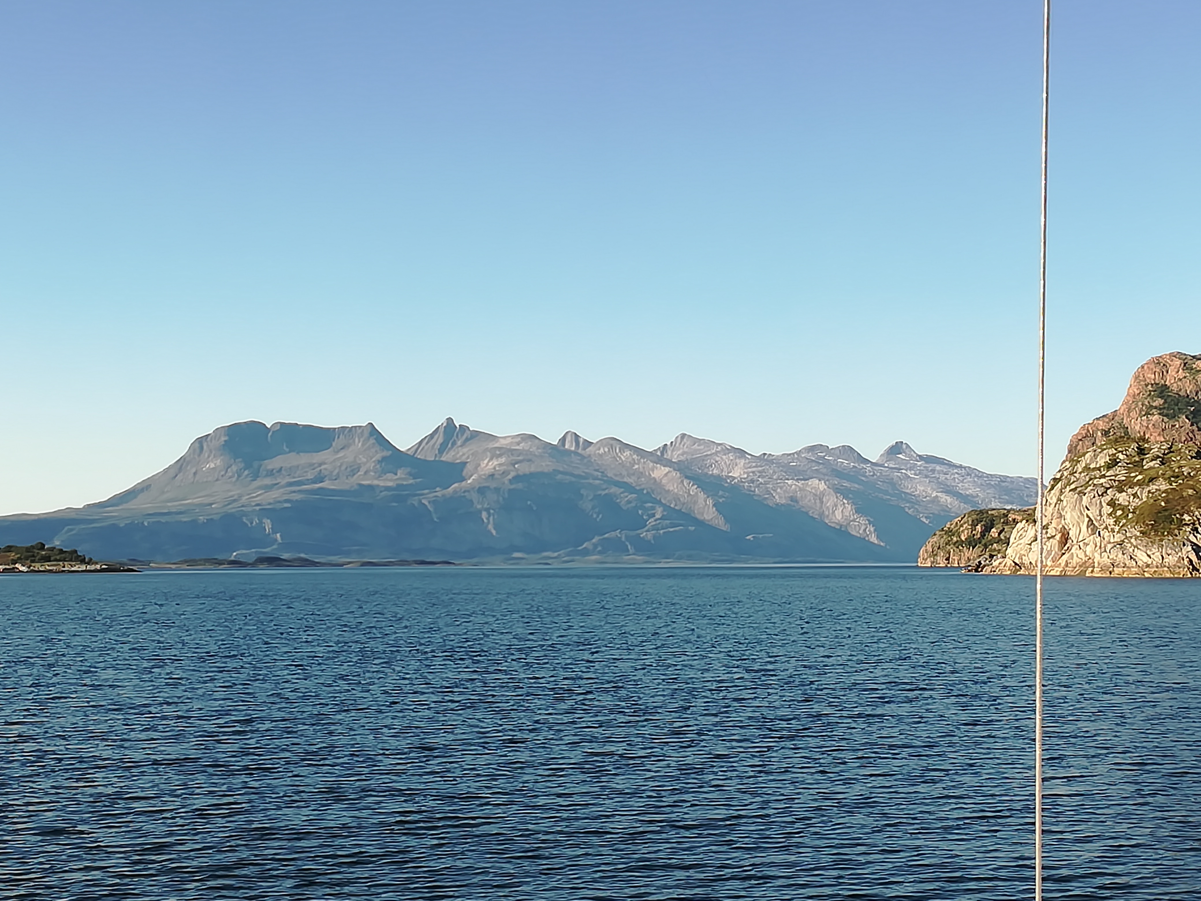 A quiet, warm morning in the marina. Our luggage was delayed when we flew to Ålesund yesterday, so we had to wait until it arrived this morning. At 11 we were out of the marina and picked up a nice SW breeze. We set both sails and are at present sailing north at 5 – 6 knots. Beautiful inshore sailing with the high mountains in the background.