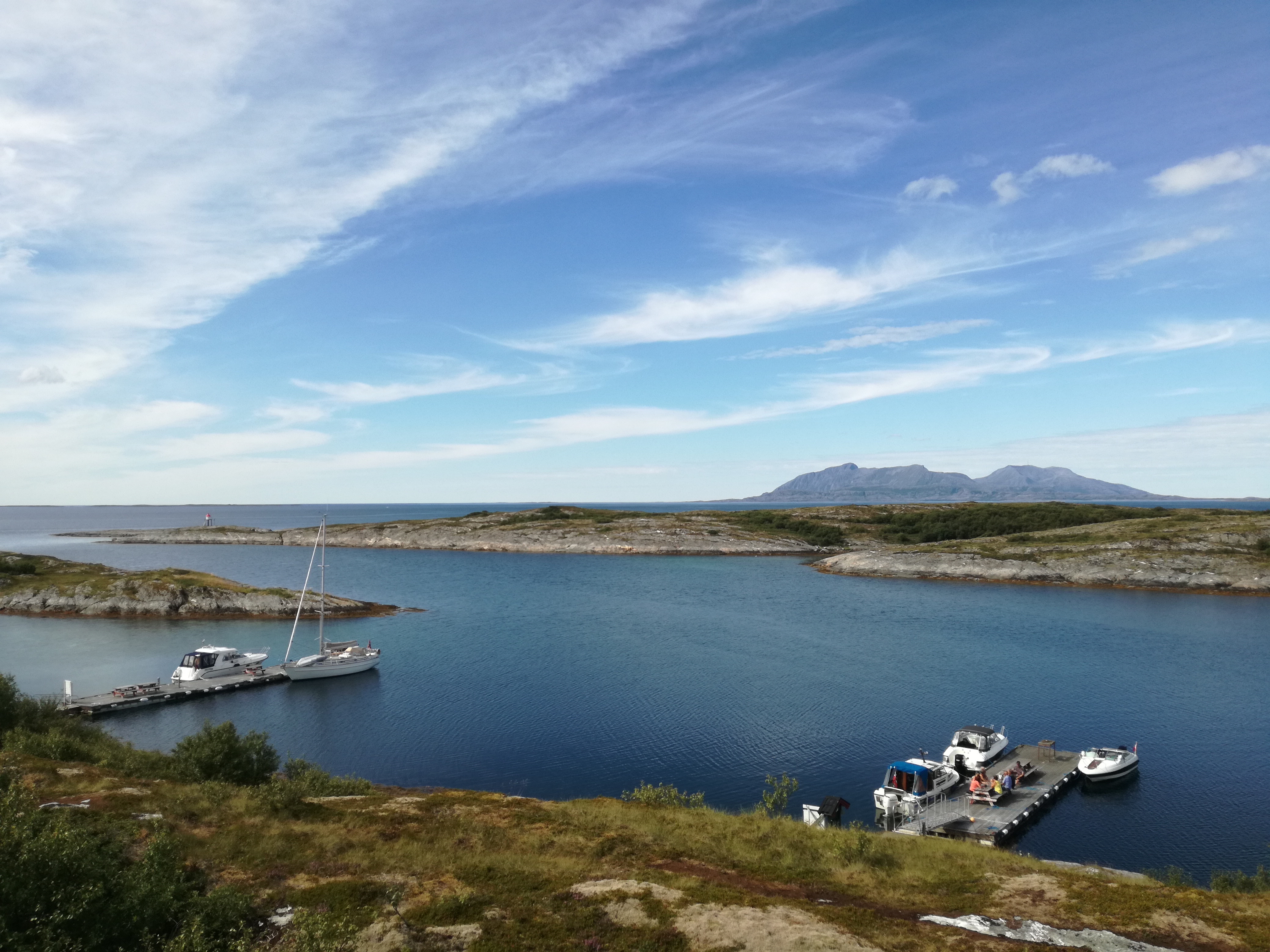 Friday we sailed (Vestavind and I) north from Brønnøysund and into Vistenfjorden. But first we stopped in a beautiful and well protected bay at Straumsøyan, where Brønnøysund boat club has put in two pontoons. There is a small playground on the shore, and little sandy beaches. A good place for families. There was only one boat there when we came in, with a single man, a retired farmer. He was so happy that he didn’t have any daily obligations on the farm any more, and could go away like this for weeks. He had farmed for forty years.