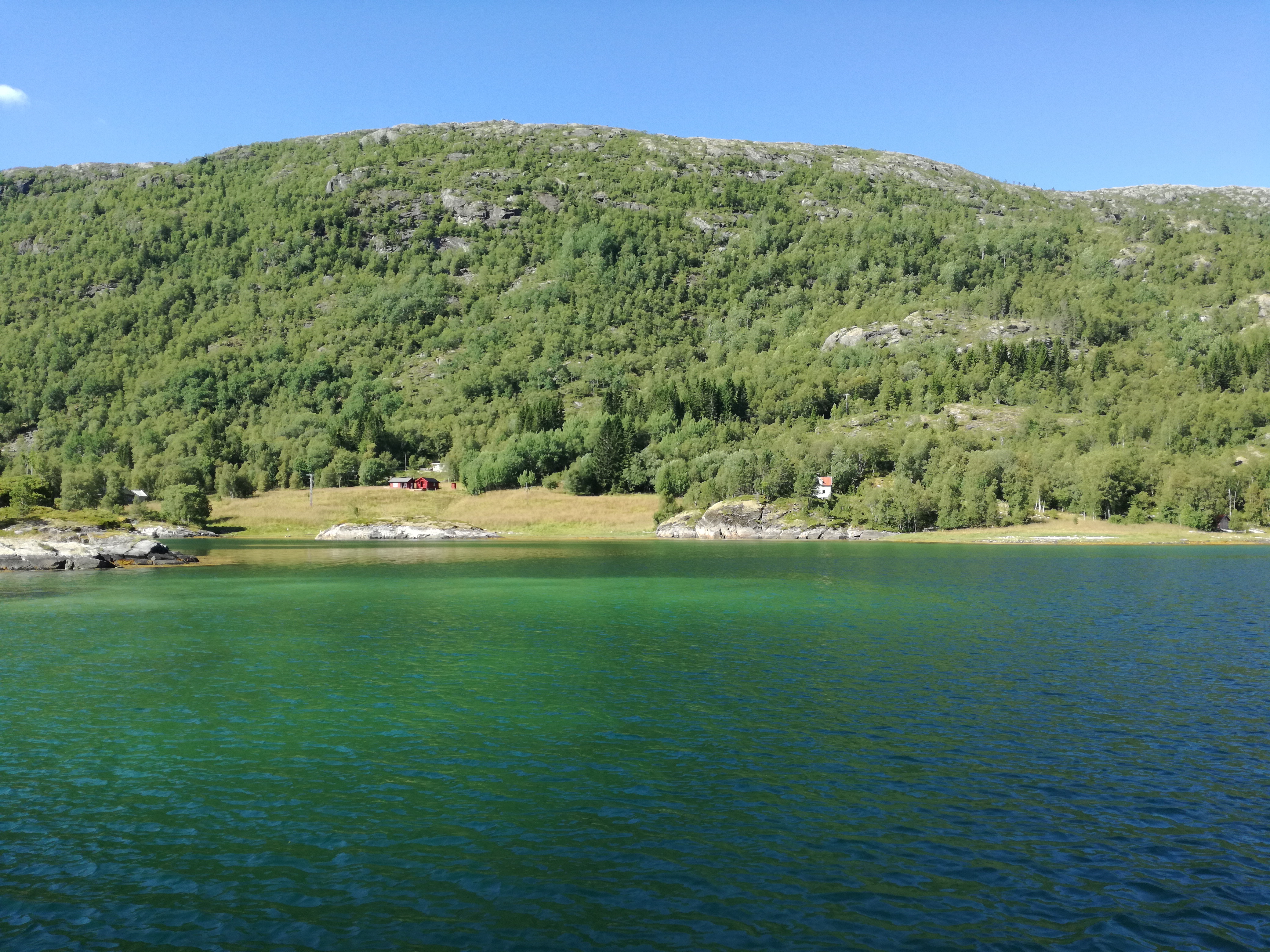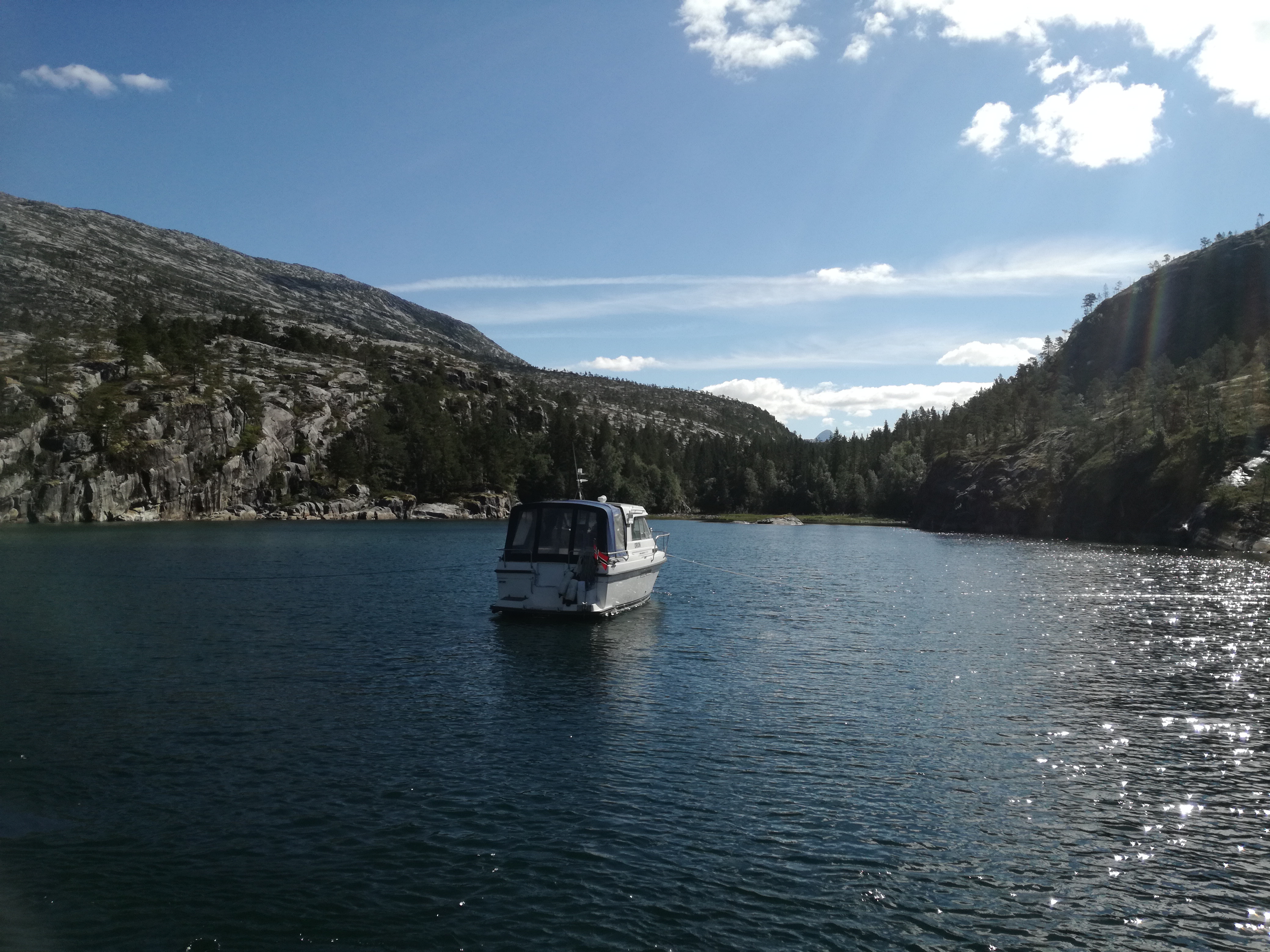 Next morning, I wanted to check out other possible anchorages in the end of the fjord, and found this one promising. But someone apparently thought they owned the bay and had virtually closed it off with ropes across to both sides. Not the way to do it! With anchor instead, there could have been room for others. But you seldom see boats at anchor in Norway. Norwegians seem to think they must be tied up to dry land, not to a bottom they can’t see. But then, on the west and north coast, there are so few boats out that there is a bay for each! I have seen very few boats these weeks I have been been out, and there has always been room in the marinas.