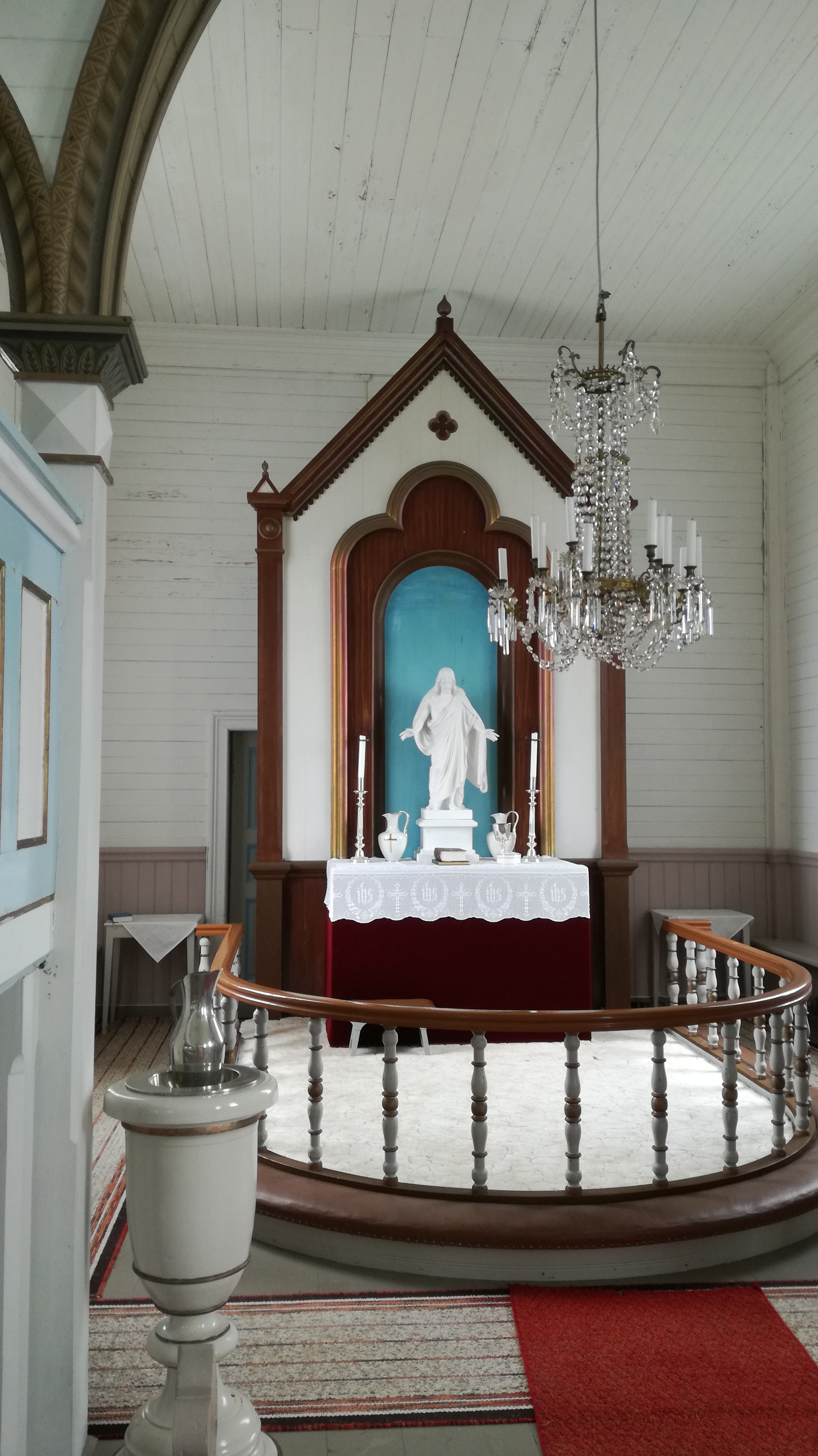 The church was built in 1889, brought from Trøndelag, whrer they were building a new church. It was pulled down there, put on a boat and brought here.
