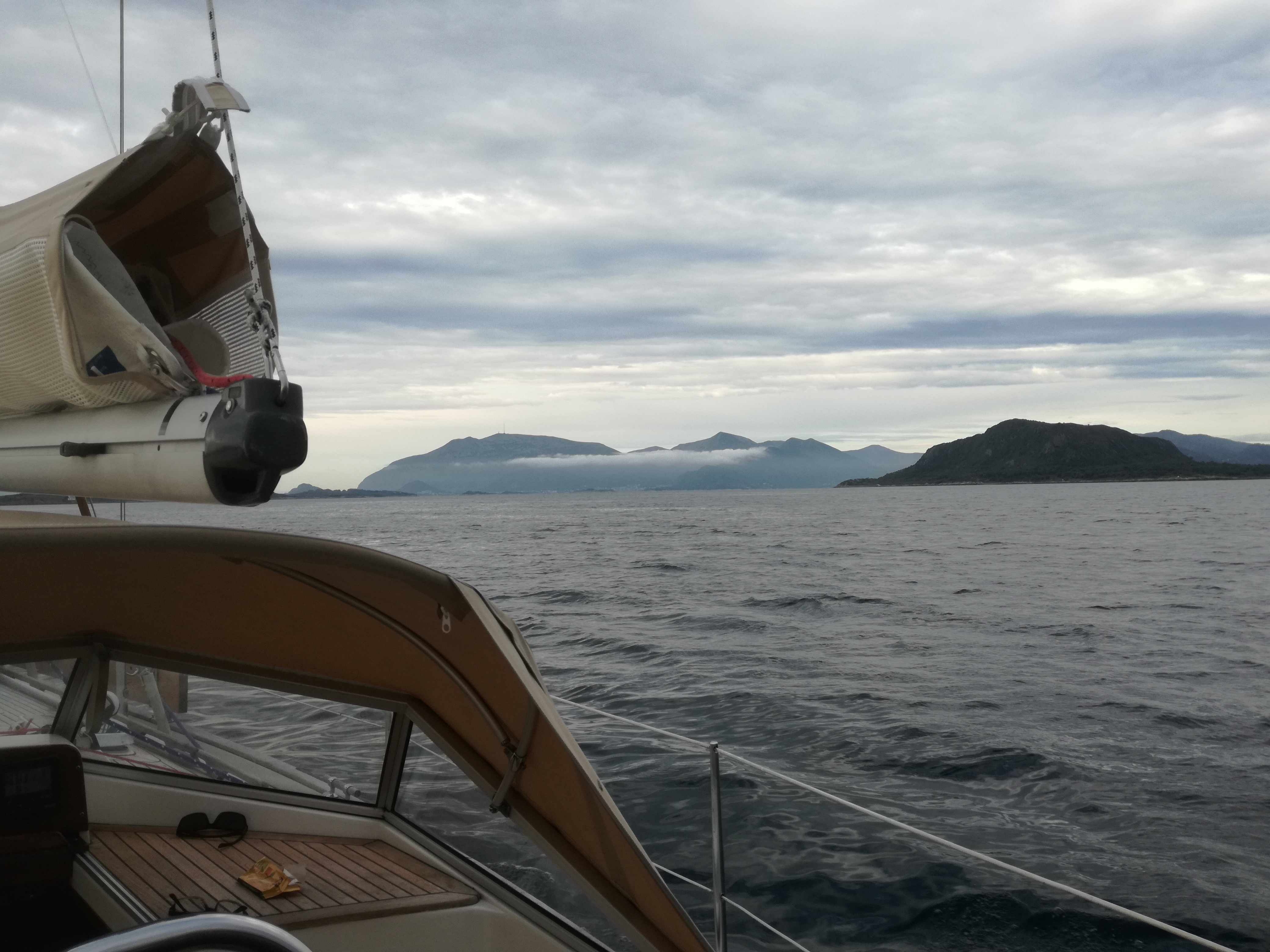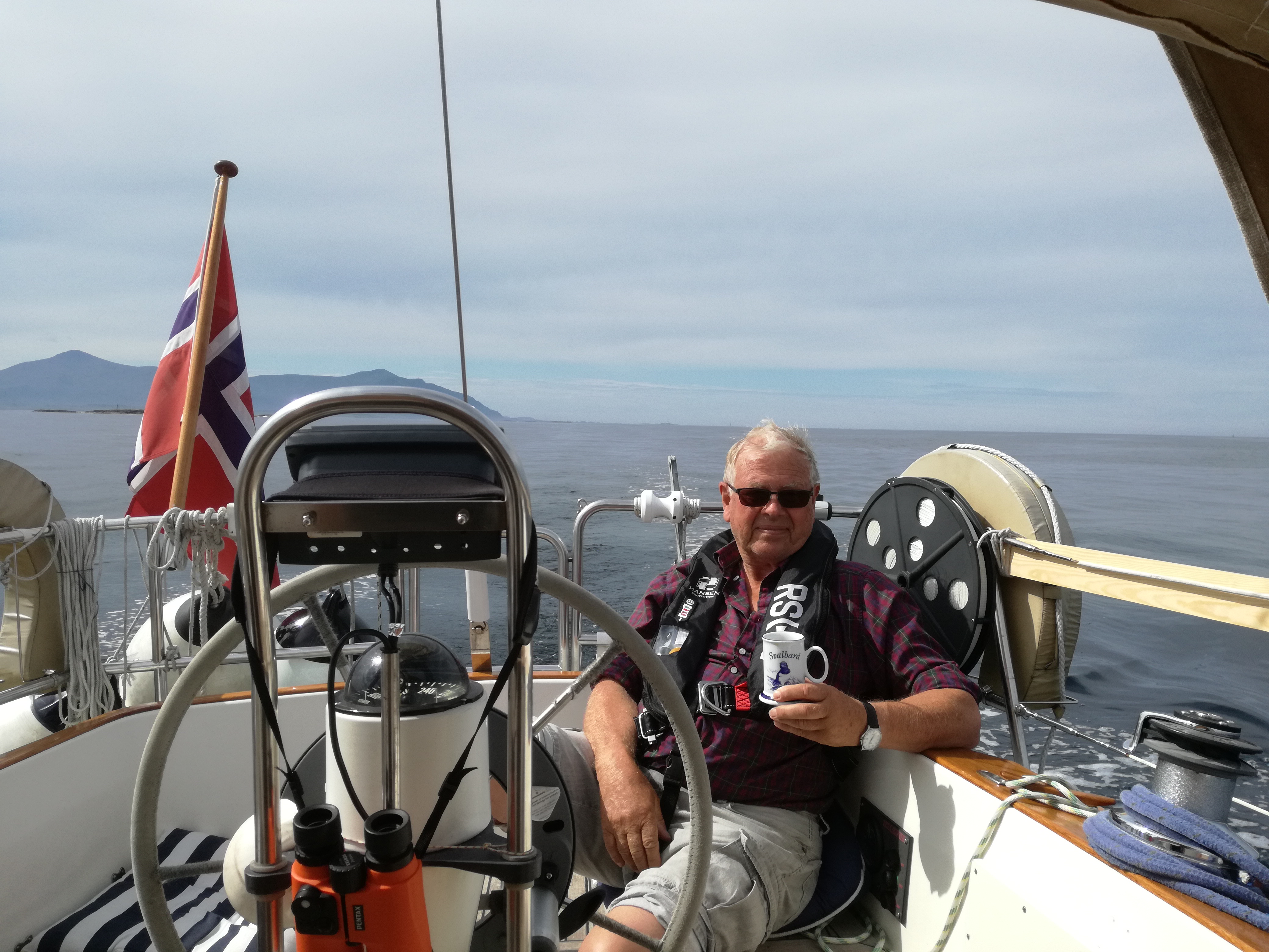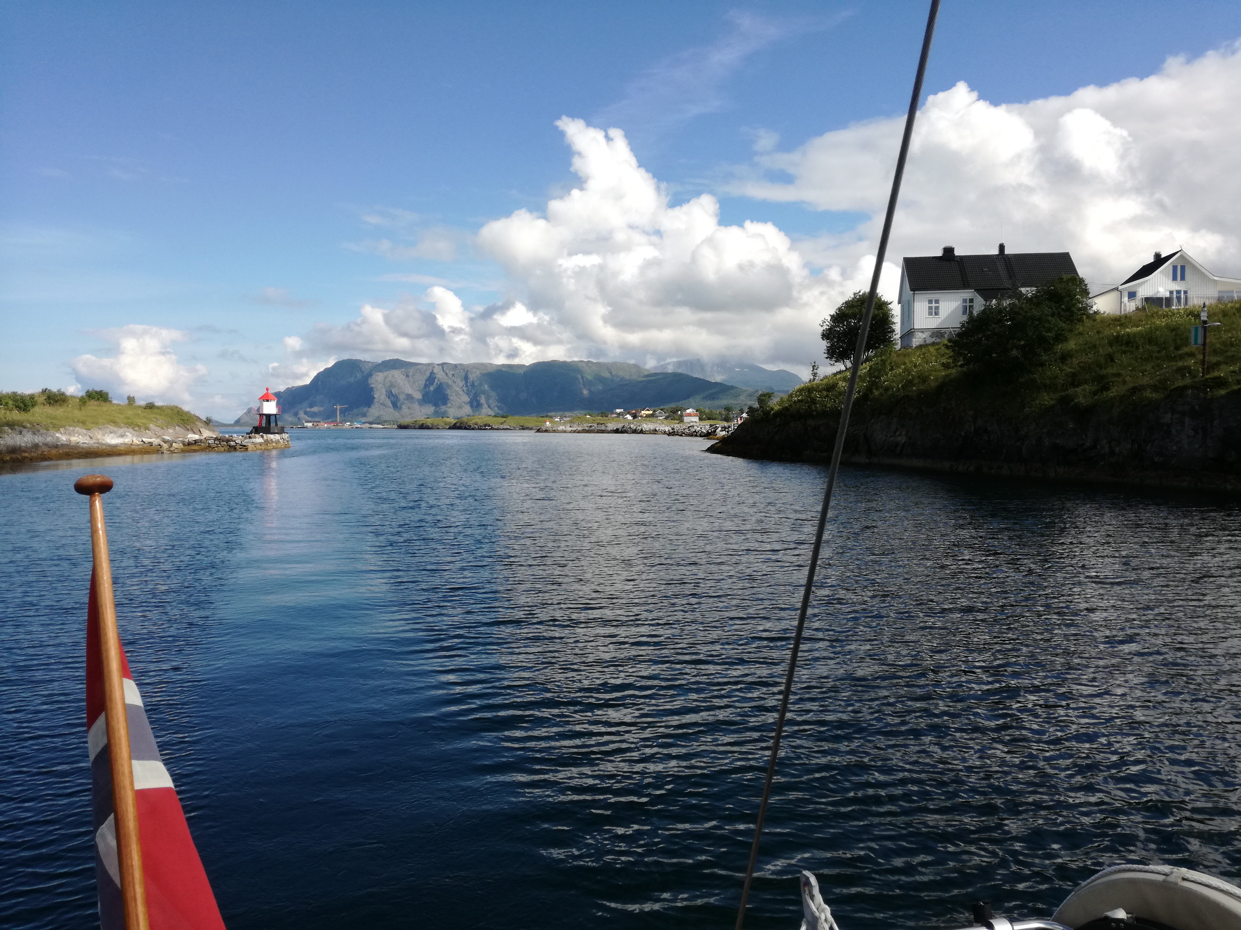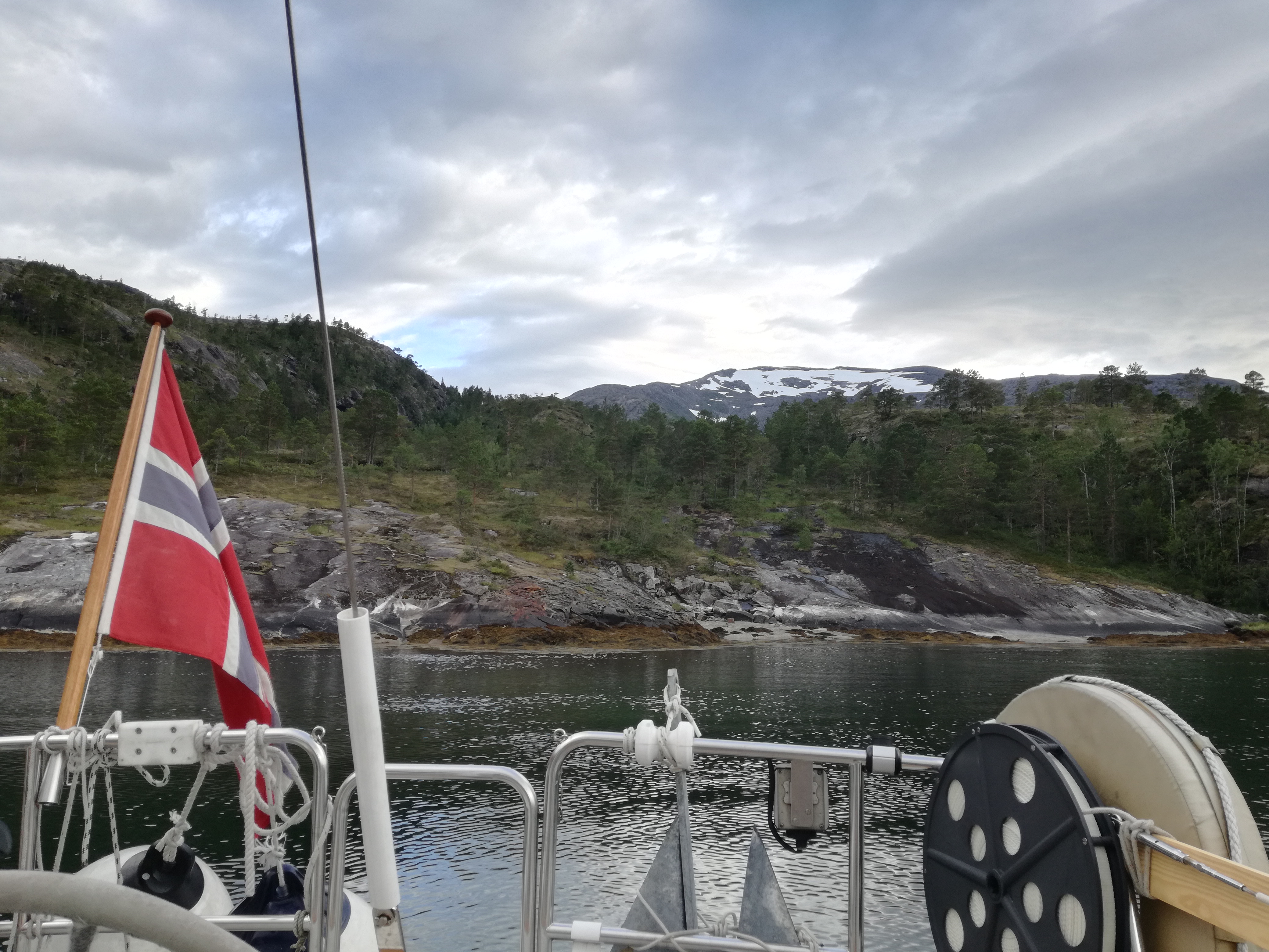 We left Veiholmen early, at 06.30, through a narrow channel to the north east. It is well marked, as are all the common and less common seaways along the coast. Having an old skipper on board has been very interesting and helpful, and good company. I learn a lot about coastal navigation. And hear many stories from his almost 65 years at sea. He started with his father when he was 15 with local traffic along the west coast of Norway, and took part in herring fisheries north of Iceland when he was 18.