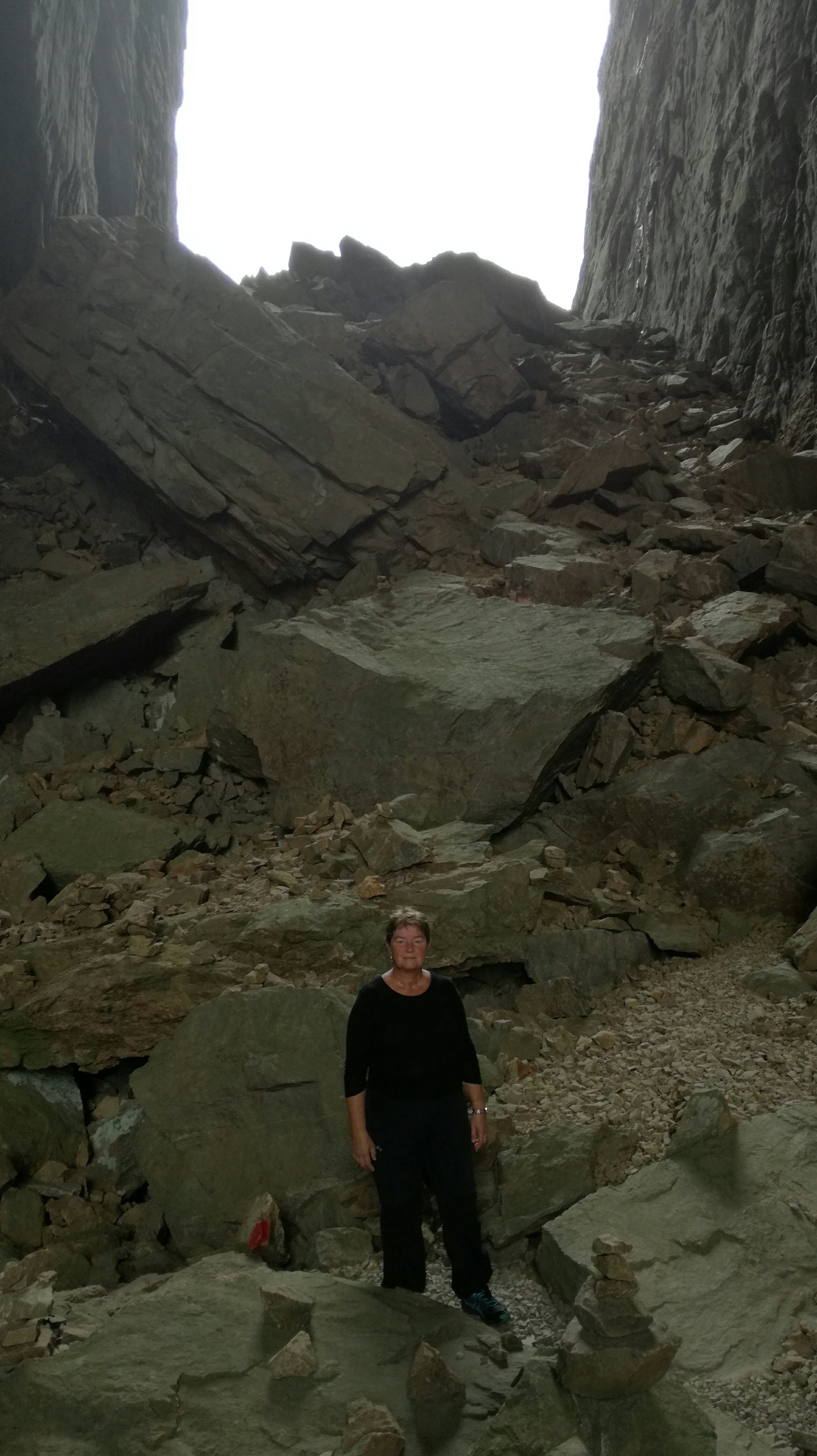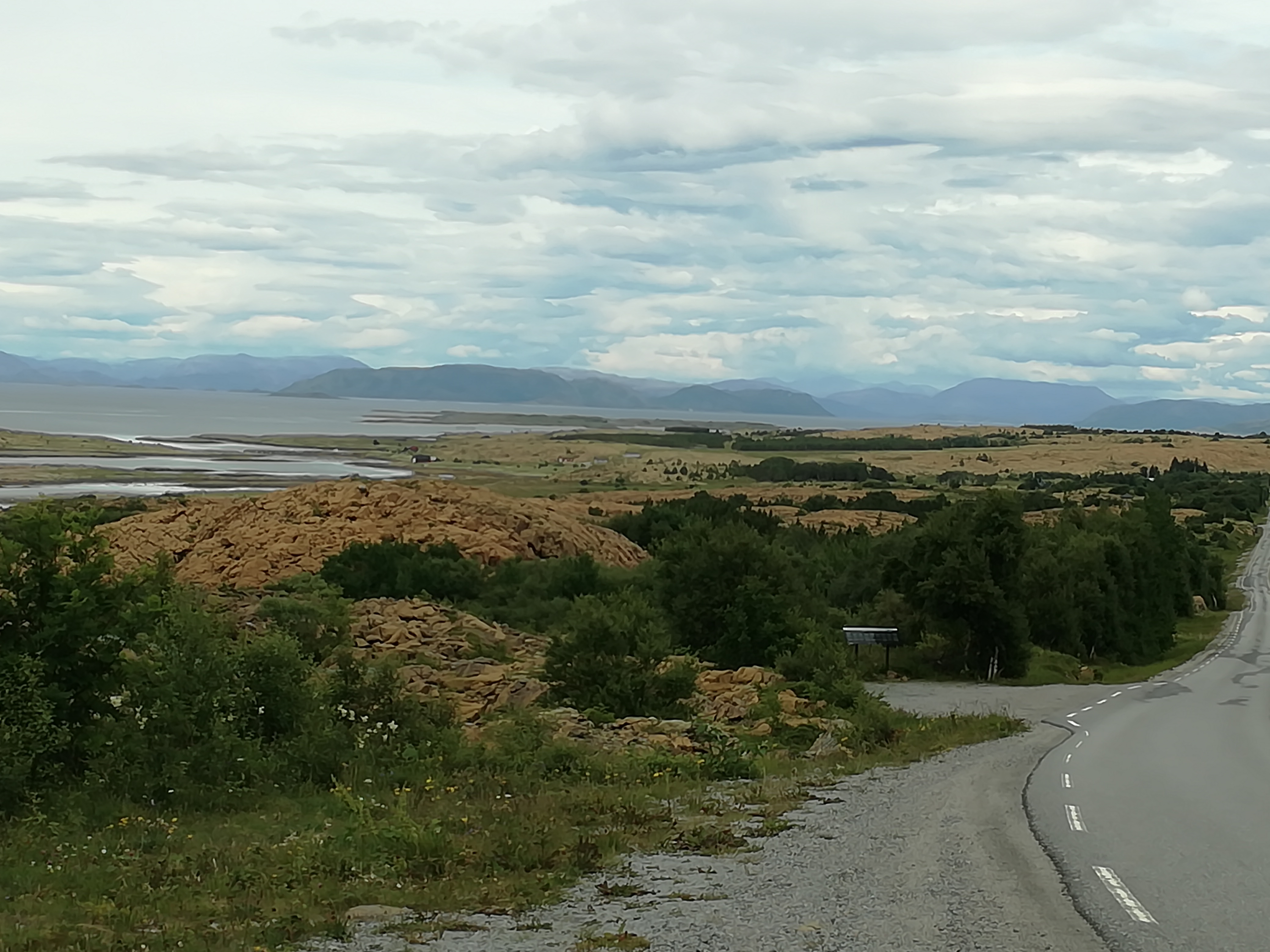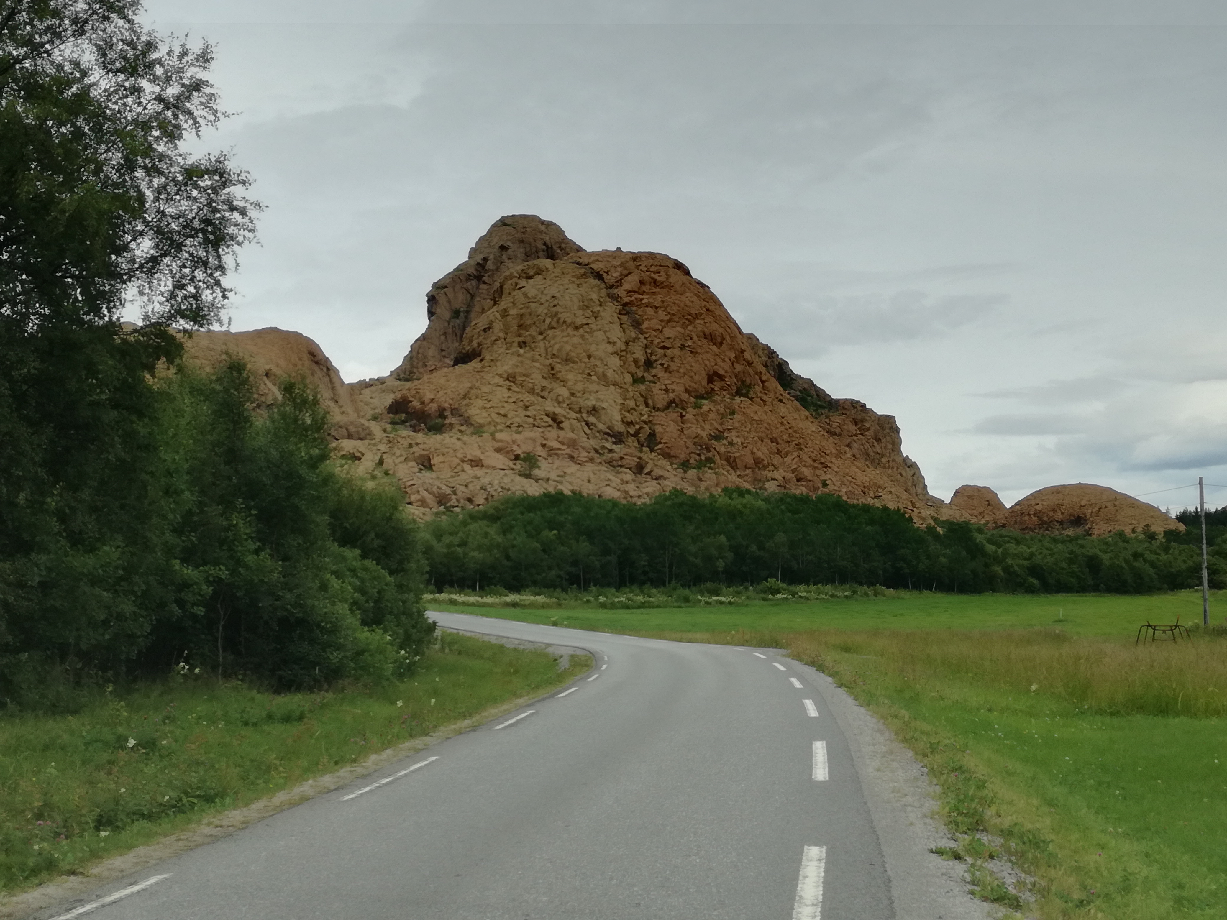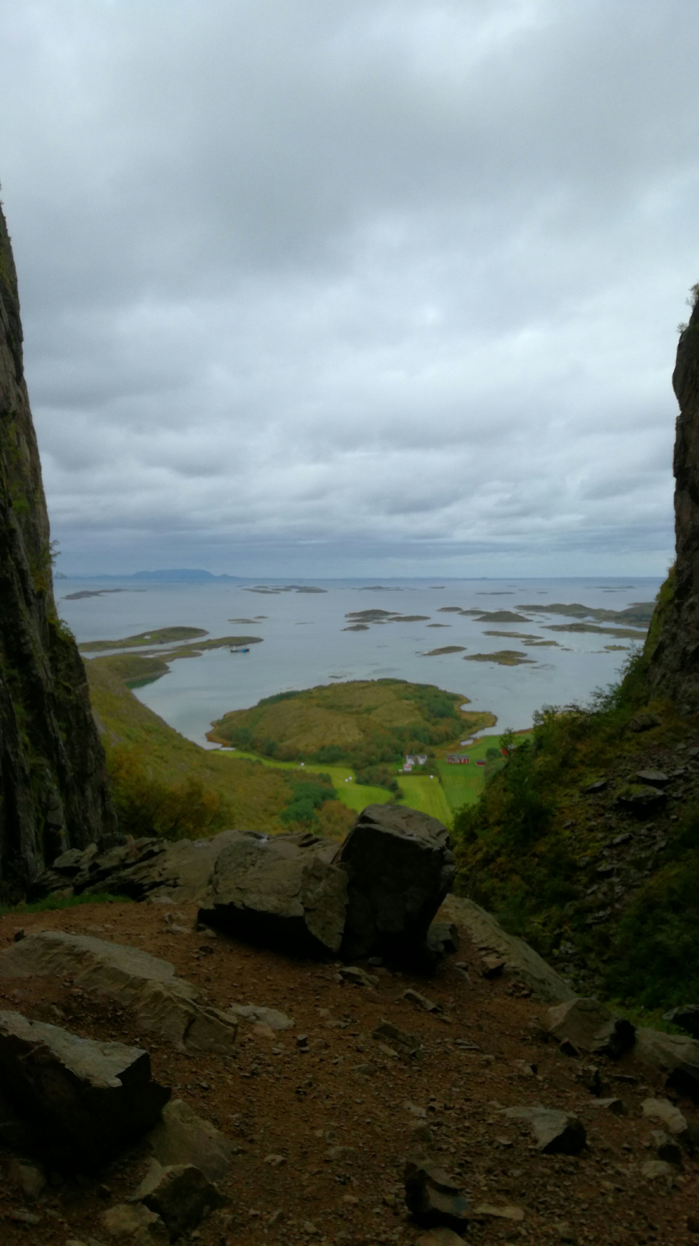Next morning was overcast, threatening rain, but we set off on foot and reached Torghatten after an hour. A magnificent, natural miracle! The hole is 160 meters long and some 20 meters high, and what acoustics! Like a big cathedral. And as it was Sunday morning, and we were alone (almost) a hymn by the local, 17th century poet and pastor Petter Dass was a natural choice!