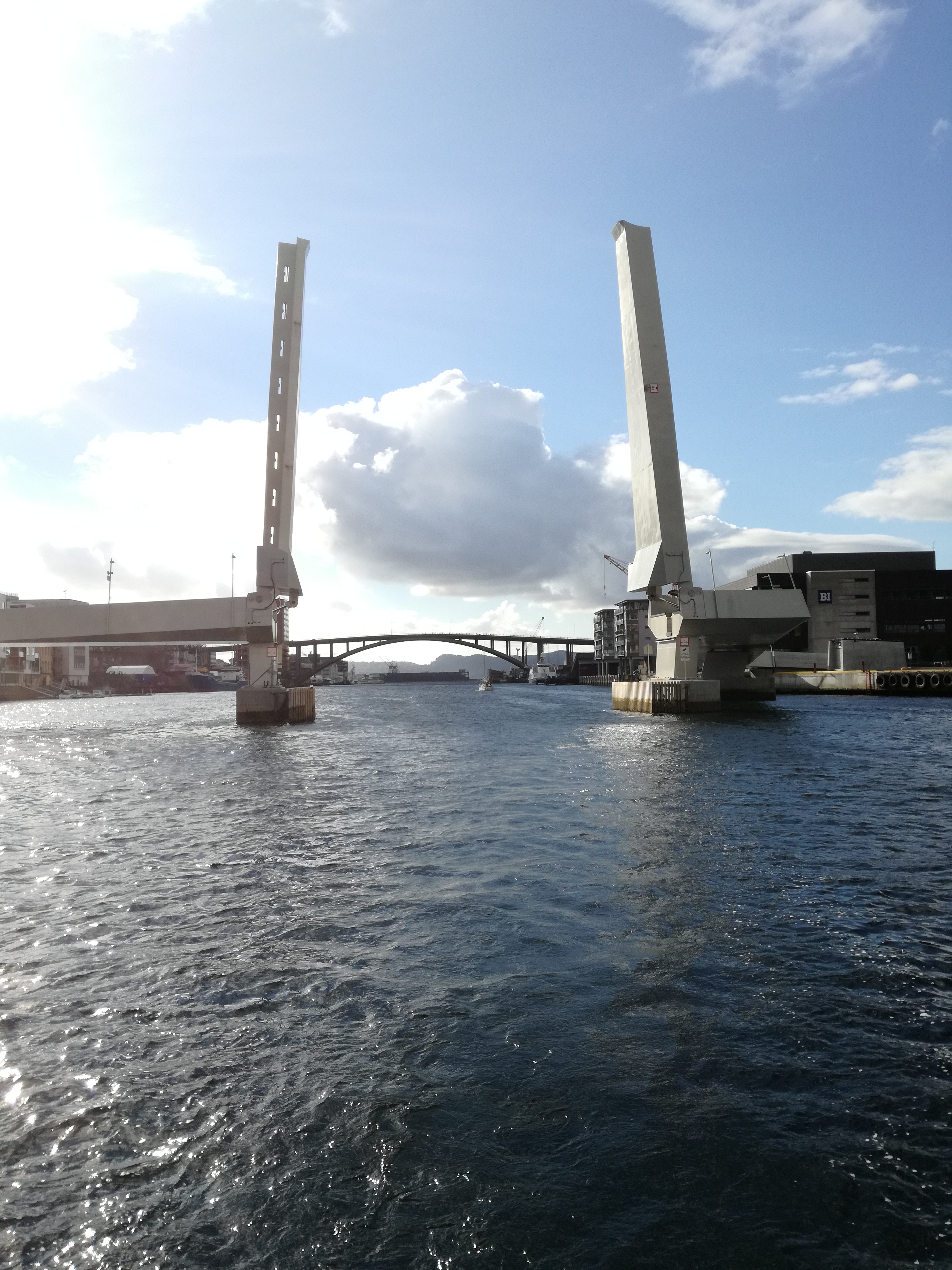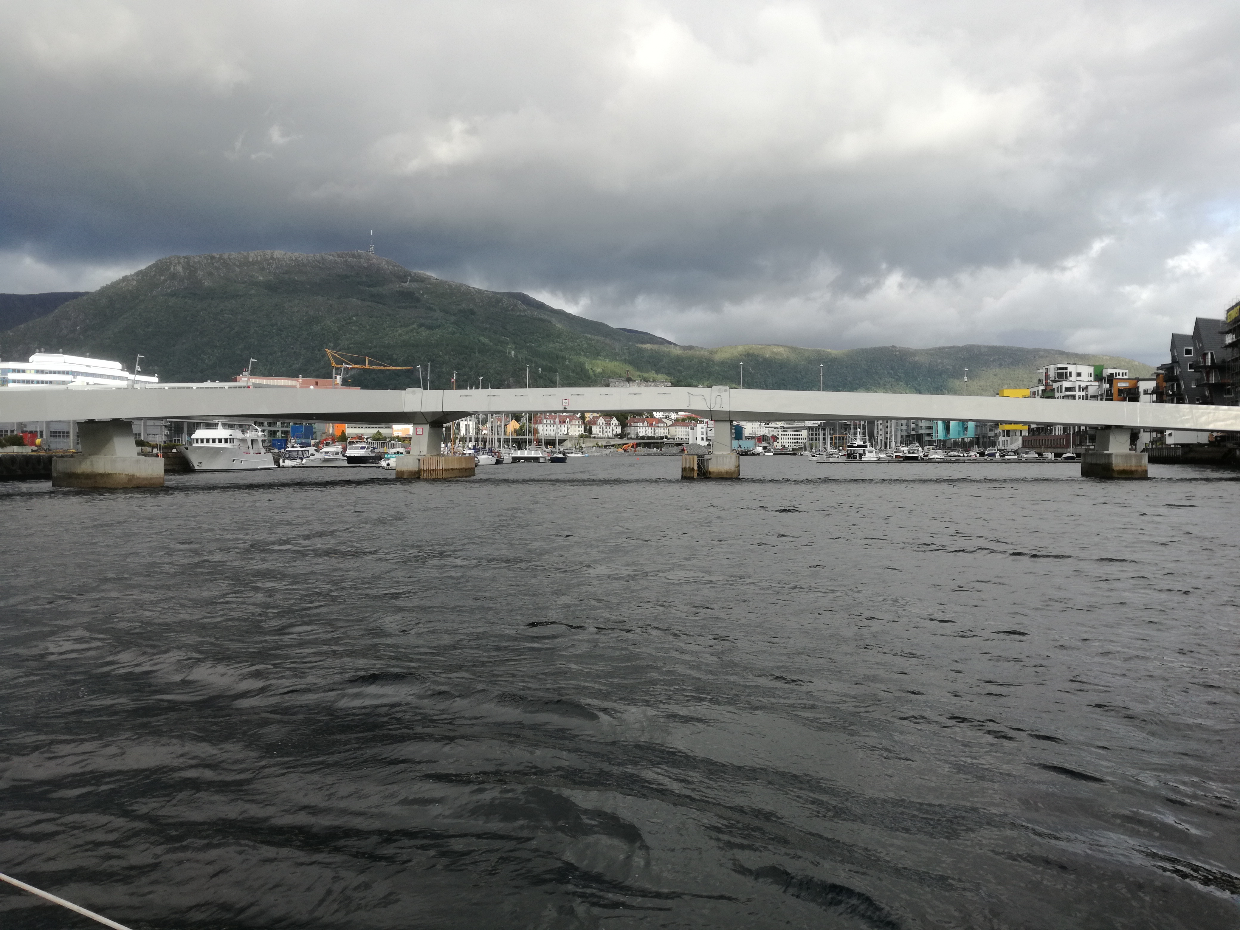 After a pleasant evening in Os with old friends Marit and Arthur, we waited next morning for the rain to pass. There was still a strong breeze, gusting to gale, when we continued north to Bergen. This took us six hours against the wind and the tide (it doesn’t show on the pictures!). Since we were here three years ago, a bridge had been built across the entrance to the visitors’ marina, so we had to wait for it to open.
