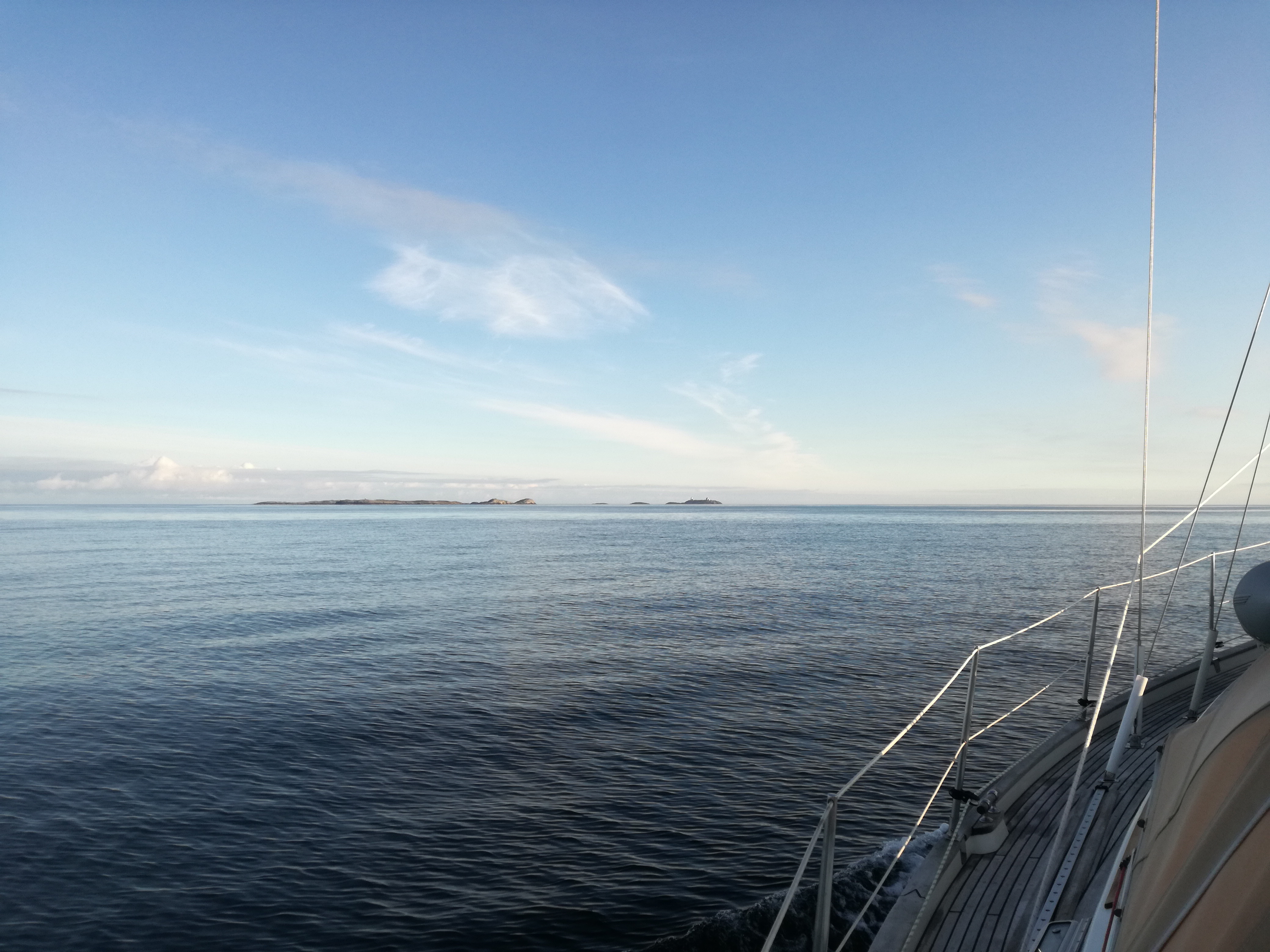 Up early. Still quiet, only very light wind from SW. Out from Fedje 06.30. Beautiful morning. The forecast is more wind from SW in the afternoon. A low pressure is coming in. We want to take benefit of the wind, but not to be caught out.