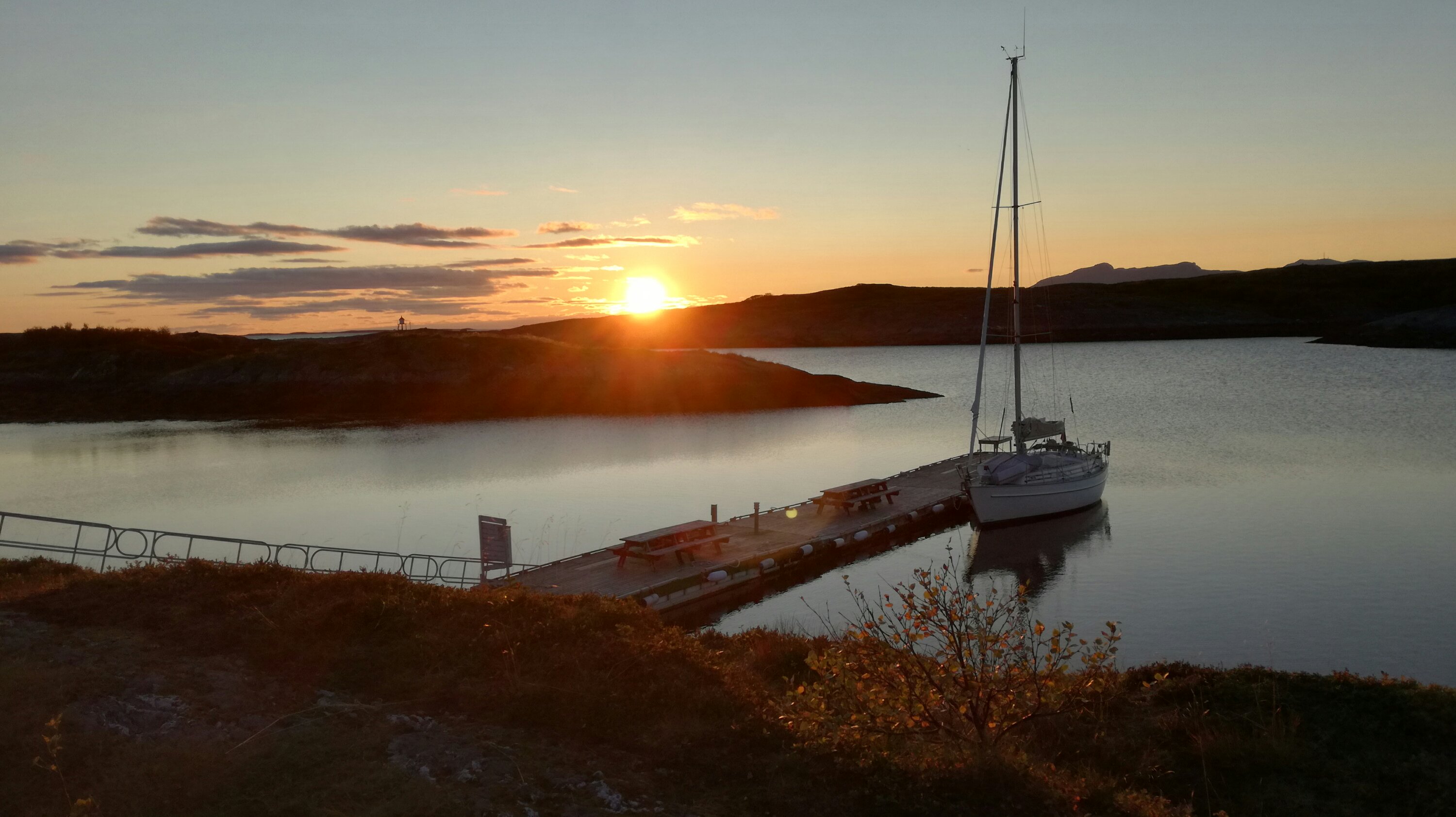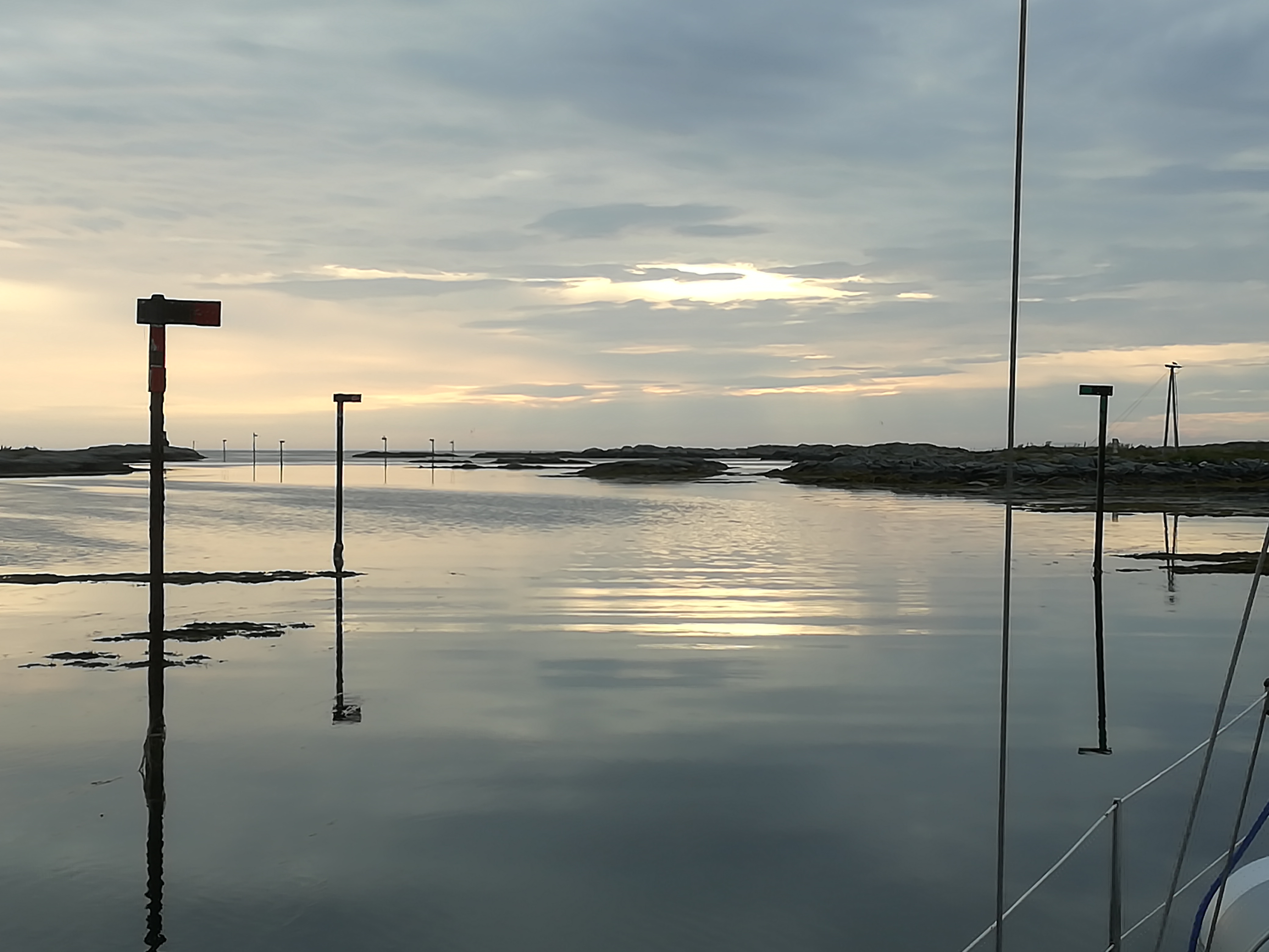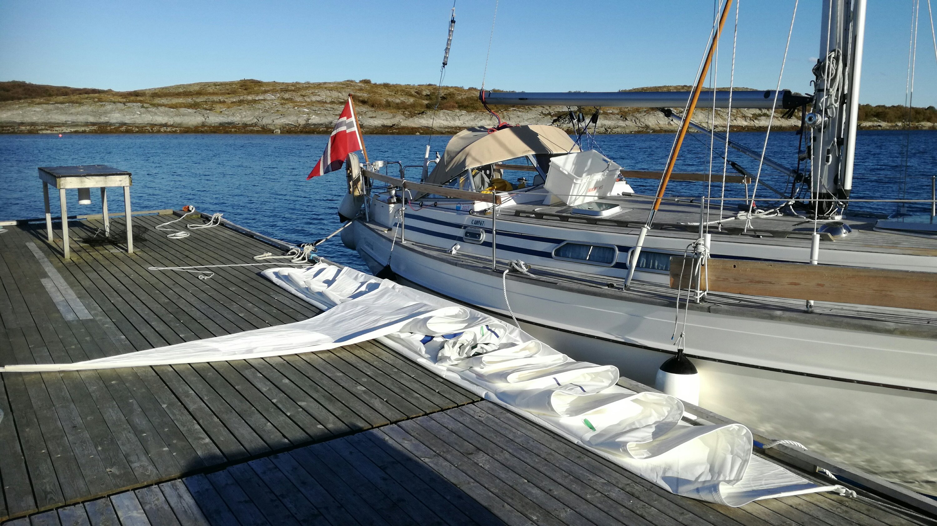 We did not have the best weather for the few days that Ellen was here, but Tuesday came with bright sunshine and a light easterly breeze. She flew home in the morning, and I sailed out to a natural harbour five miles north of the town, Straumsøyan. Here the local boat club has made two pontoons, which I knew about since I had stopped by when sailing north a month ago. This was a nice and quiet place to stay for a couple of nights, and the pontoon made a good platform for folding up and packing the sails.