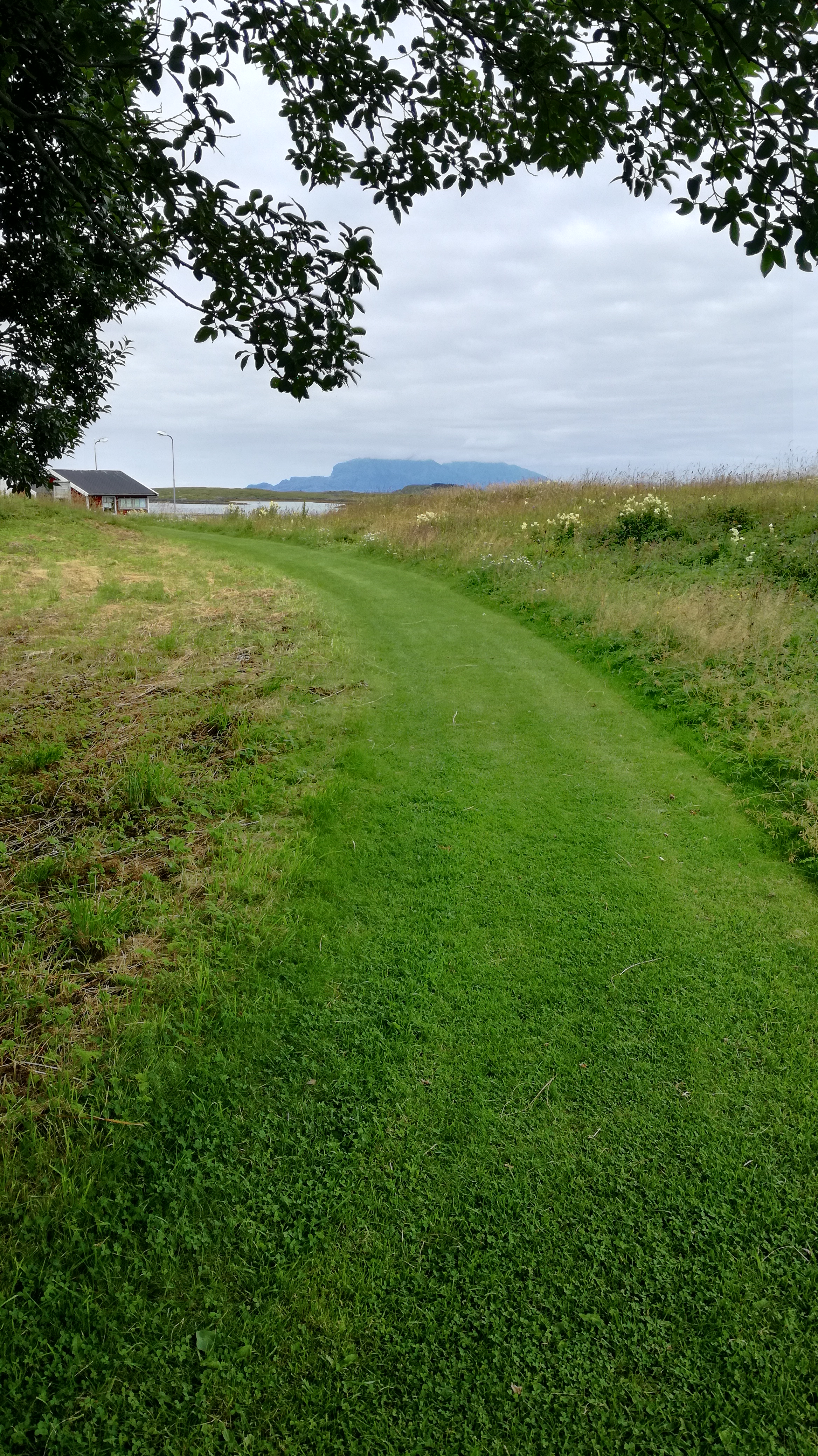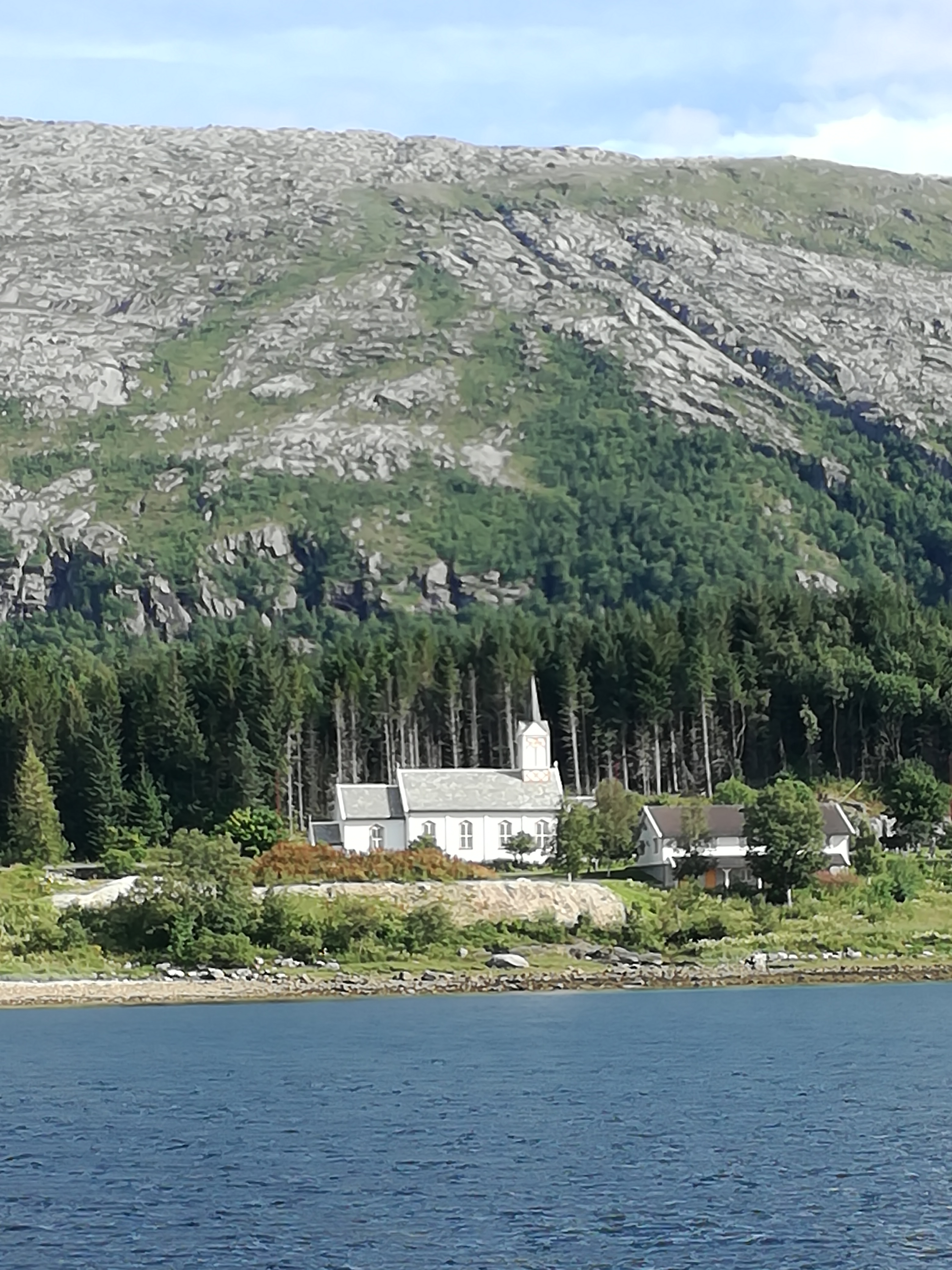 We motored across to Tjøtta, a place well known from Norwegian history from the Viking age and onwards. Otherwise a typical coastal village. I have filled water and have gone shopping, and visited the stone church from the 19th century. Close by is a research station for biology. Mainland Helgeland is a good farming area, as Tjøtta exemplifies. The place is also a communication hub.