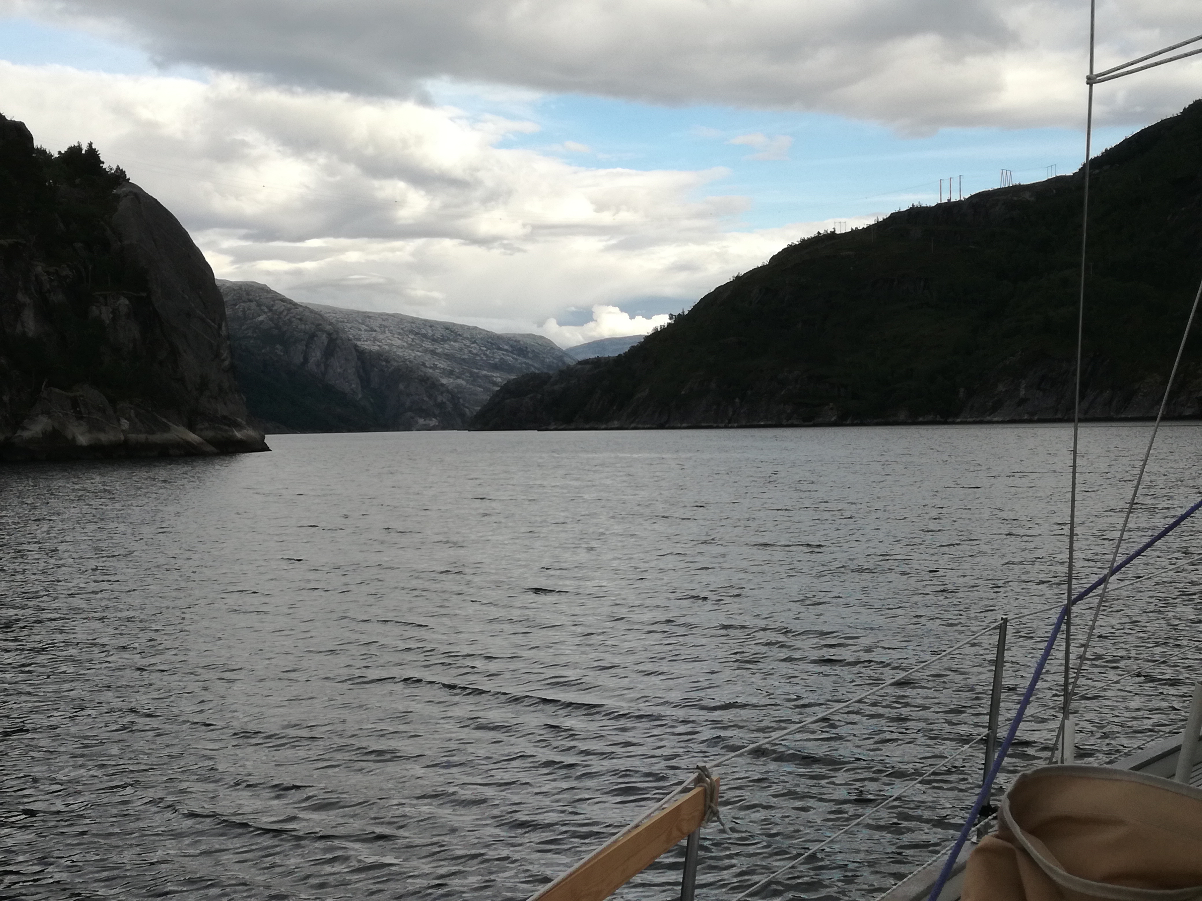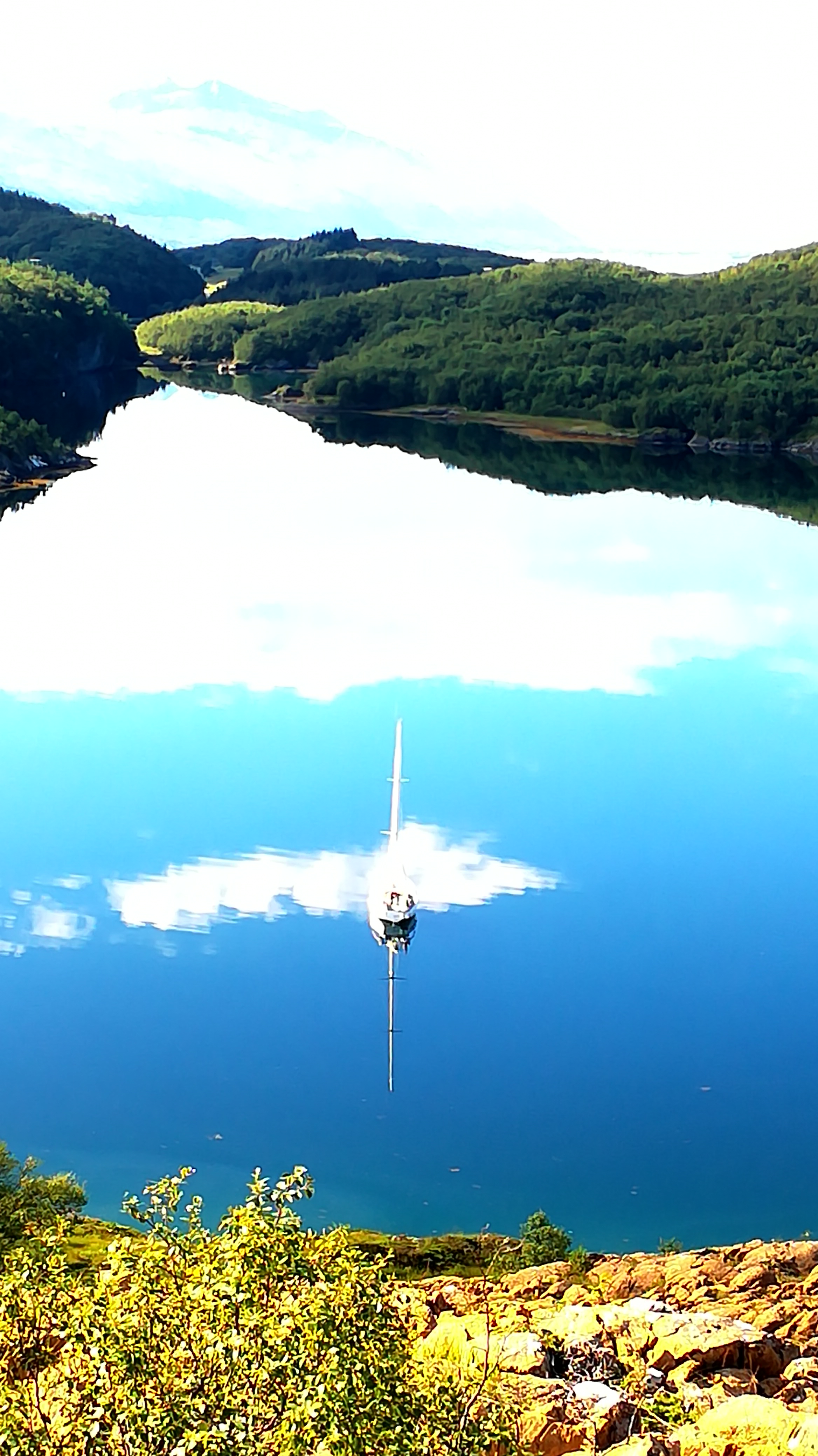 Next morning, I wanted to check out other possible anchorages in the end of the fjord, and found this one promising. But someone apparently thought they owned the bay and had virtually closed it off with ropes across to both sides. Not the way to do it! With anchor instead, there could have been room for others. But you seldom see boats at anchor in Norway. Norwegians seem to think they must be tied up to dry land, not to a bottom they can’t see. But then, on the west and north coast, there are so few boats out that there is a bay for each! I have seen very few boats these weeks I have been been out, and there has always been room in the marinas.