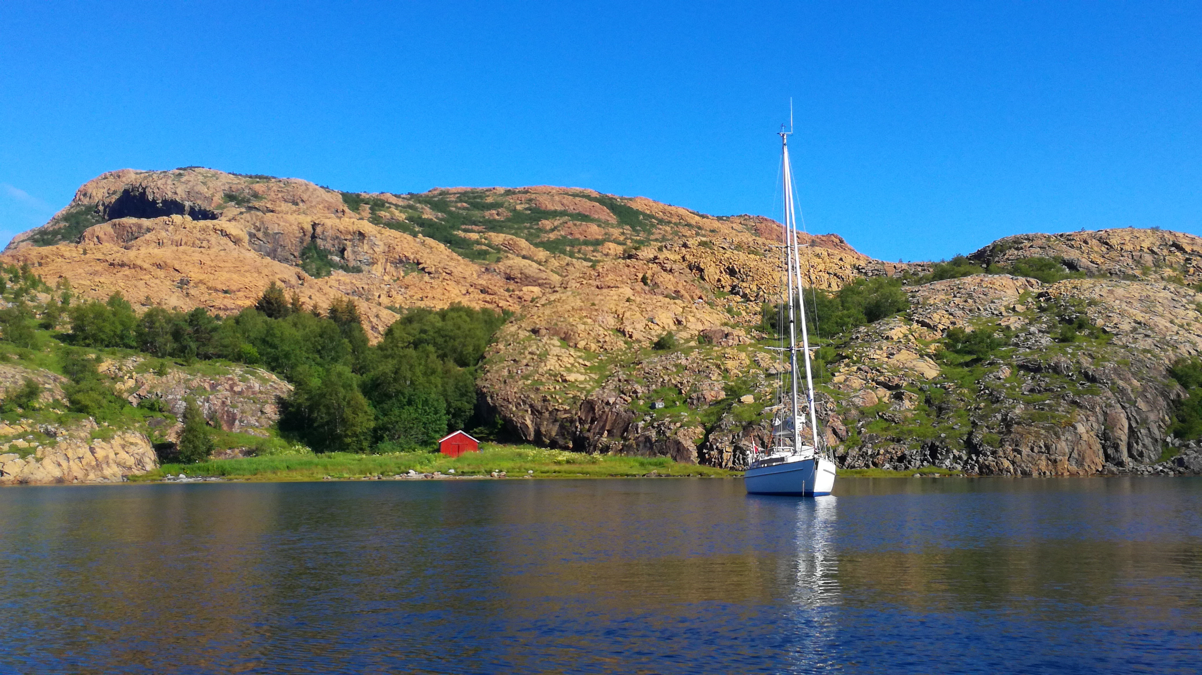 The fjord is about ten miles long, winding away into the interior. Narrow some places, but deep and well marked. There is no permanent settlement in the inner parts, but quite a lot of cabins some places. We had a strong headwind coming out the fjord for the first part, but in the inner part a it was calm. We anchored in one of the innermost bays, at 20 metres. I am glad I had bought more anchor chain. Vestavind has now 60 metres, and that is minimum when anchoring at 20 metres. You should have at least three times as much as the depth, preferably four or five times.