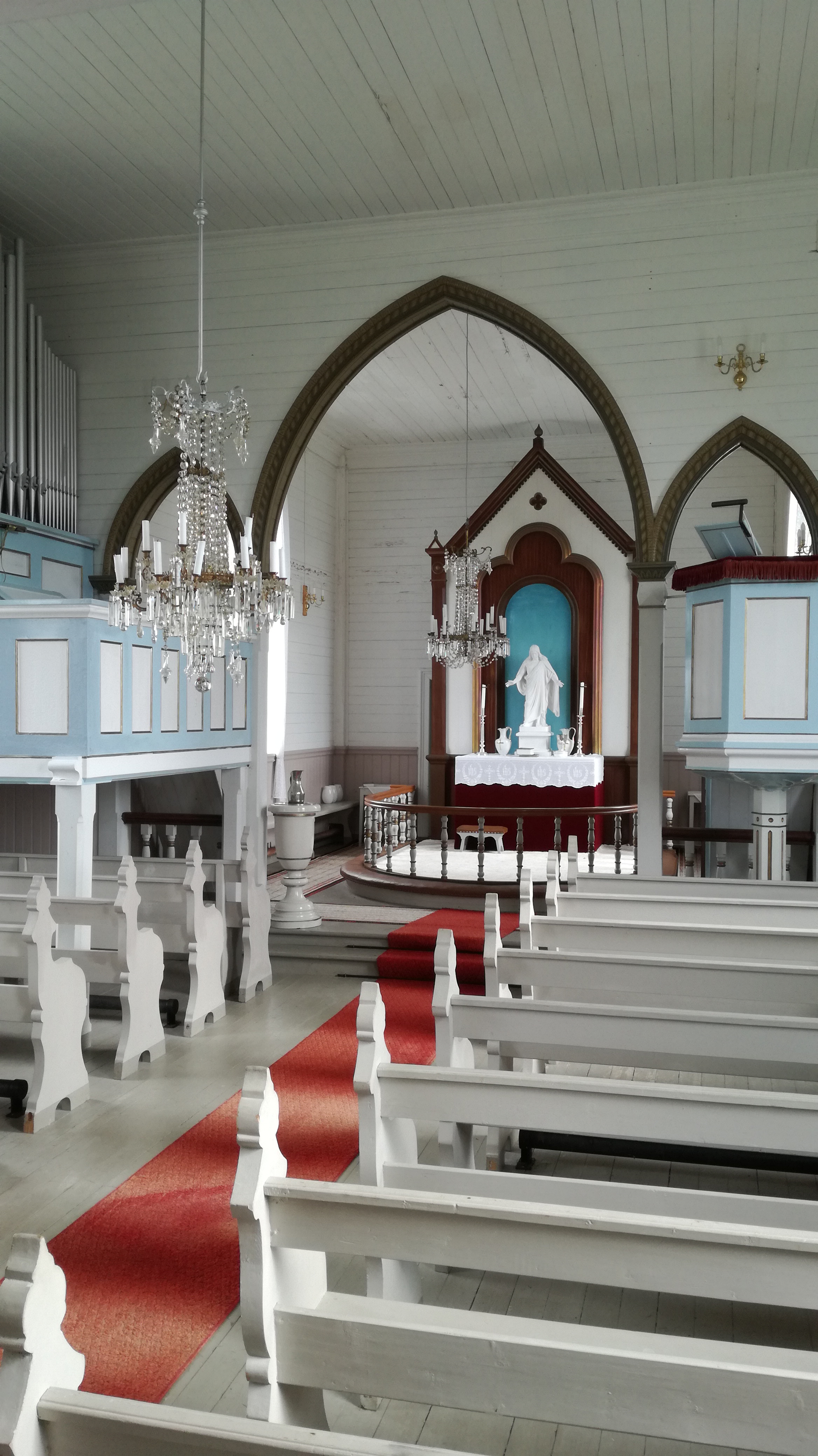 The church was built in 1889, brought from Trøndelag, whrer they were building a new church. It was pulled down there, put on a boat and brought here.