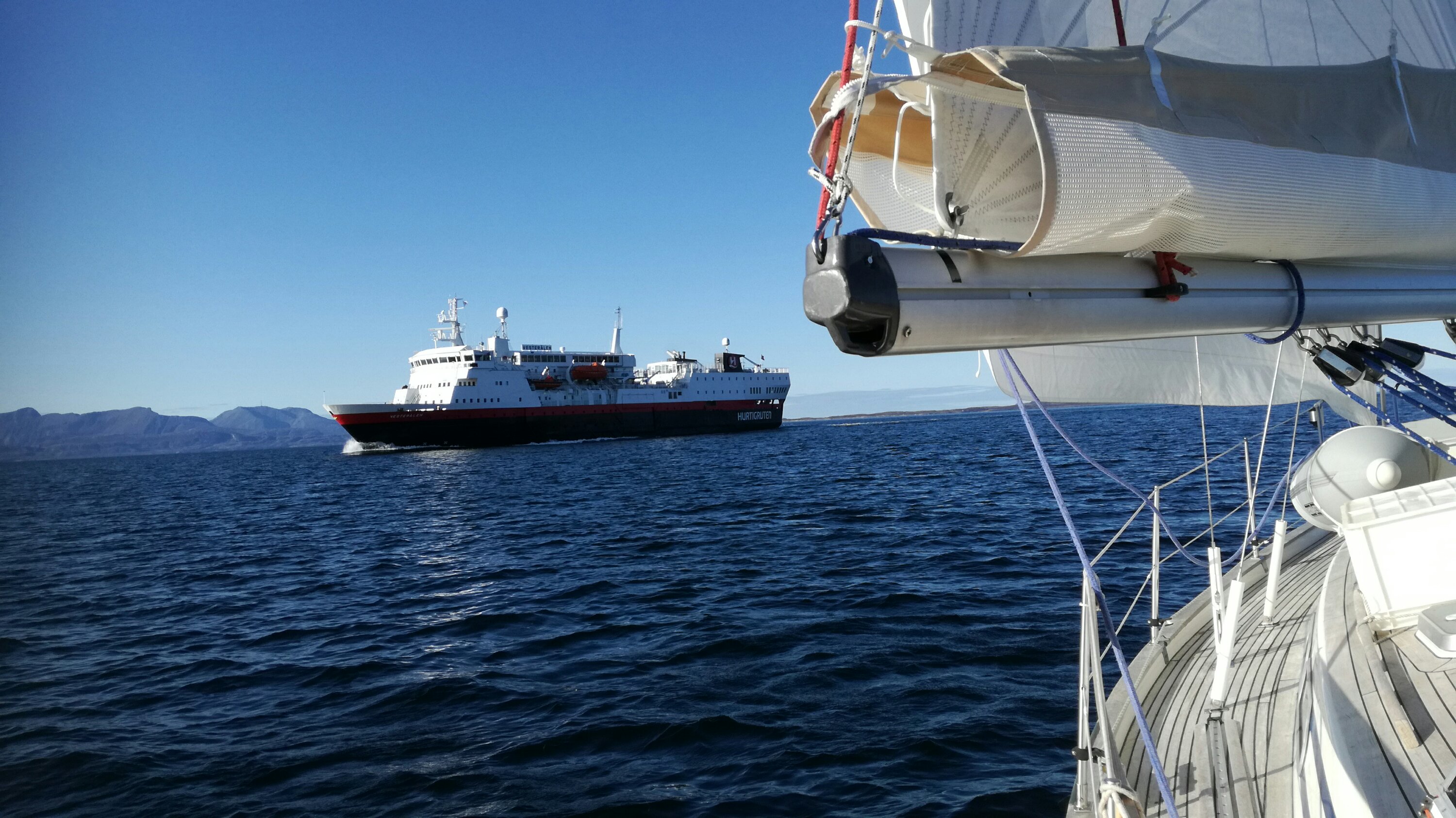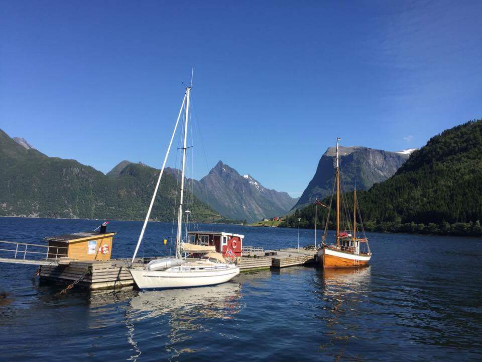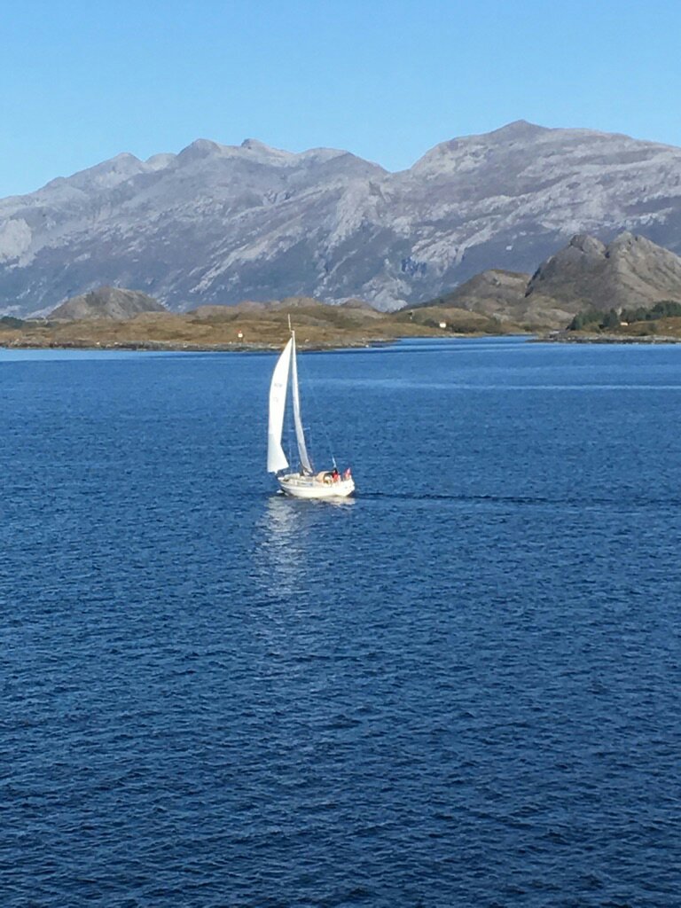 A quiet, warm morning in the marina. Our luggage was delayed when we flew to Ålesund yesterday, so we had to wait until it arrived this morning. At 11 we were out of the marina and picked up a nice SW breeze. We set both sails and are at present sailing north at 5 – 6 knots. Beautiful inshore sailing with the high mountains in the background.