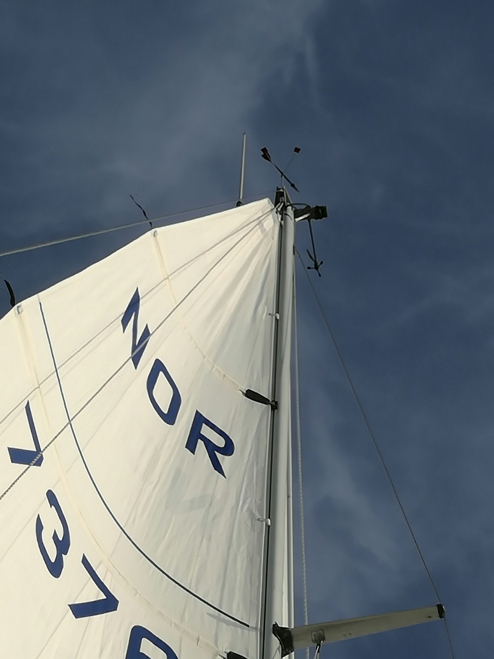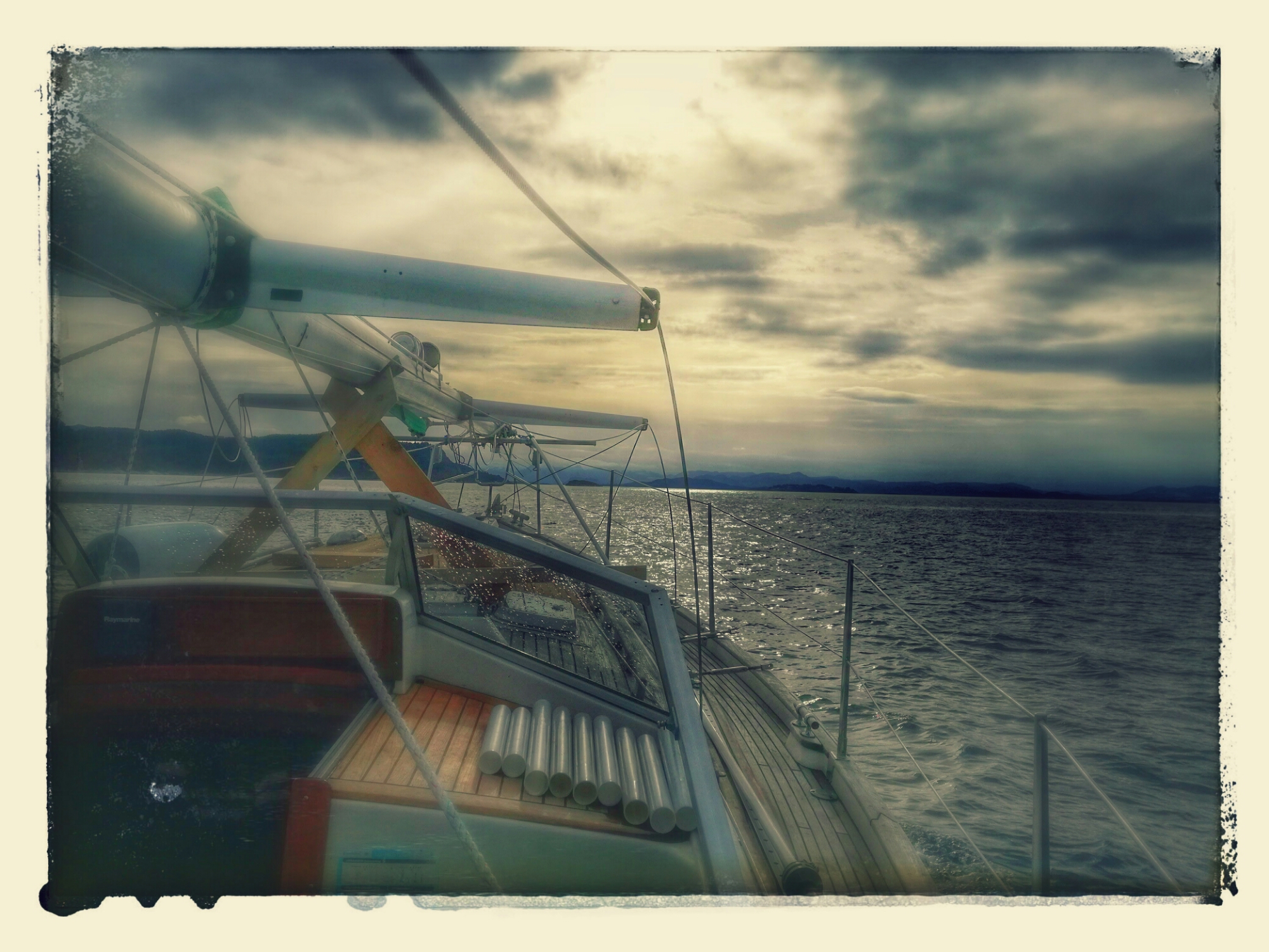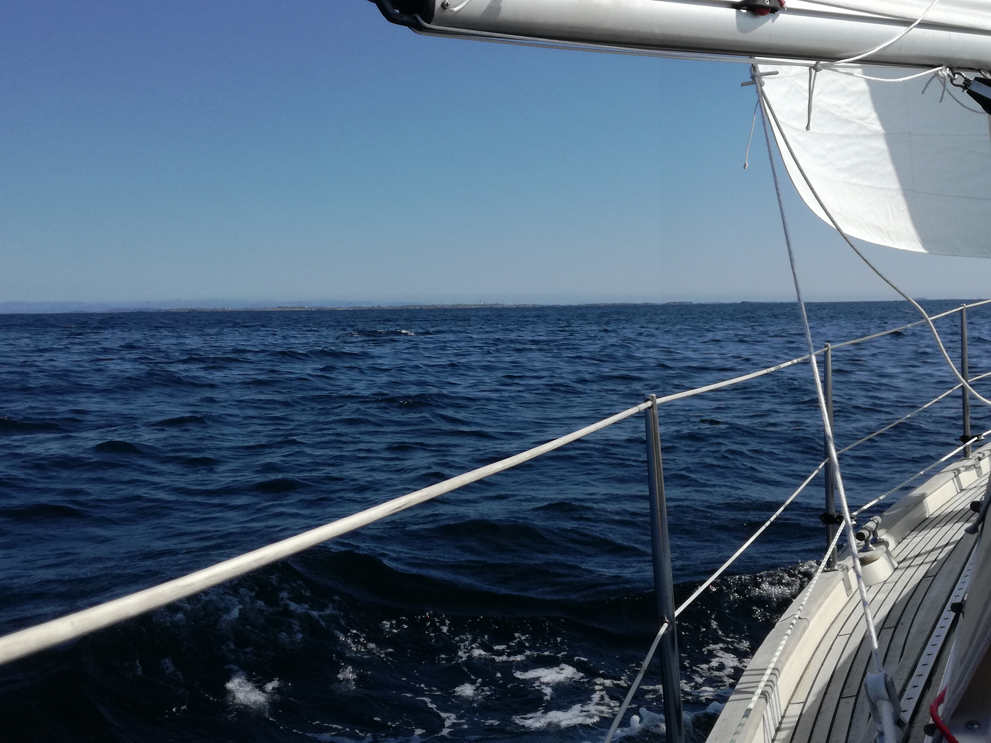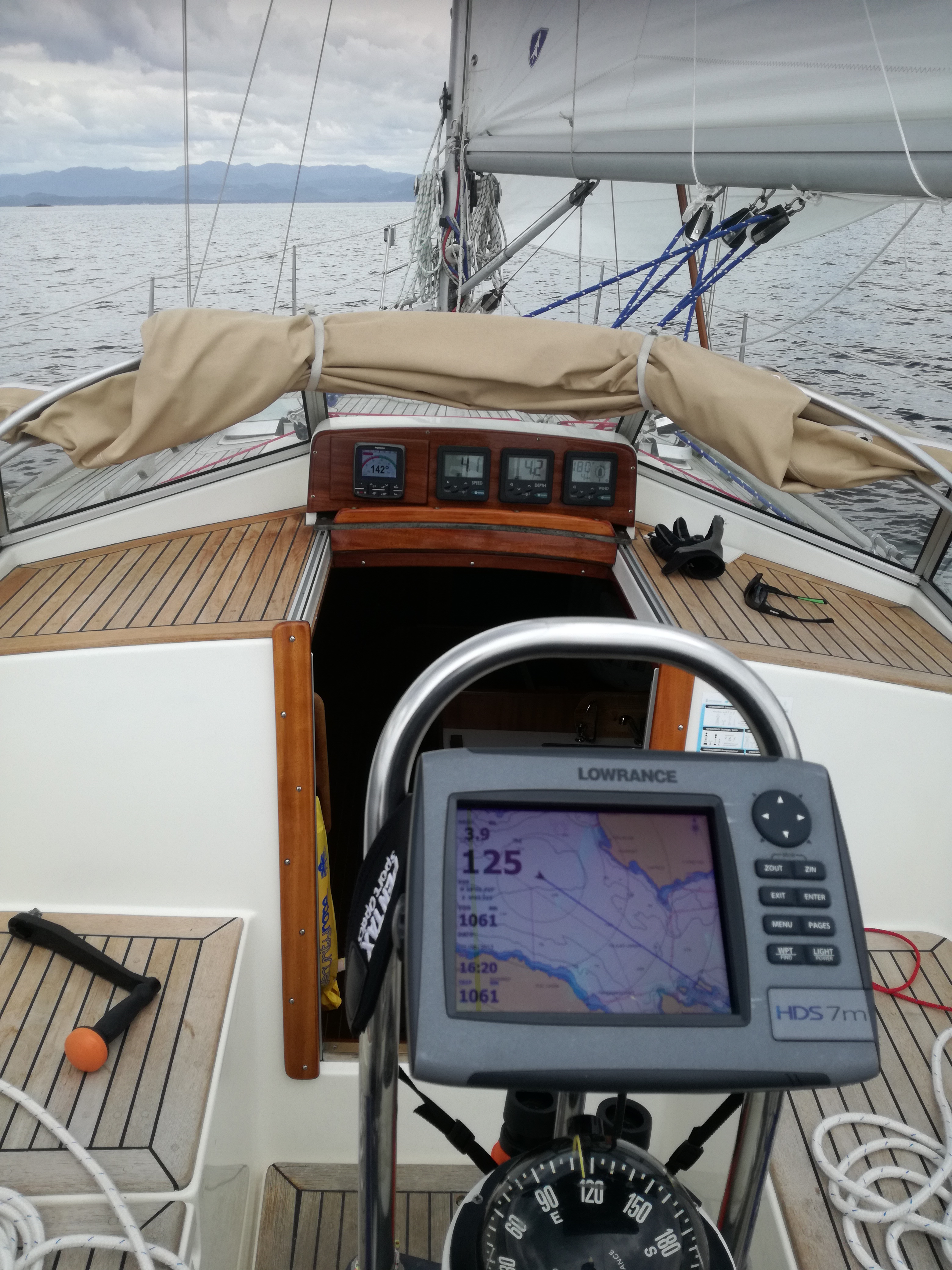 A short sail in light winds just around the island. I am so happy with the new sails. With the right trim upwind, she just stays on course on her own. I don’t need to touch the wheel for a long time.