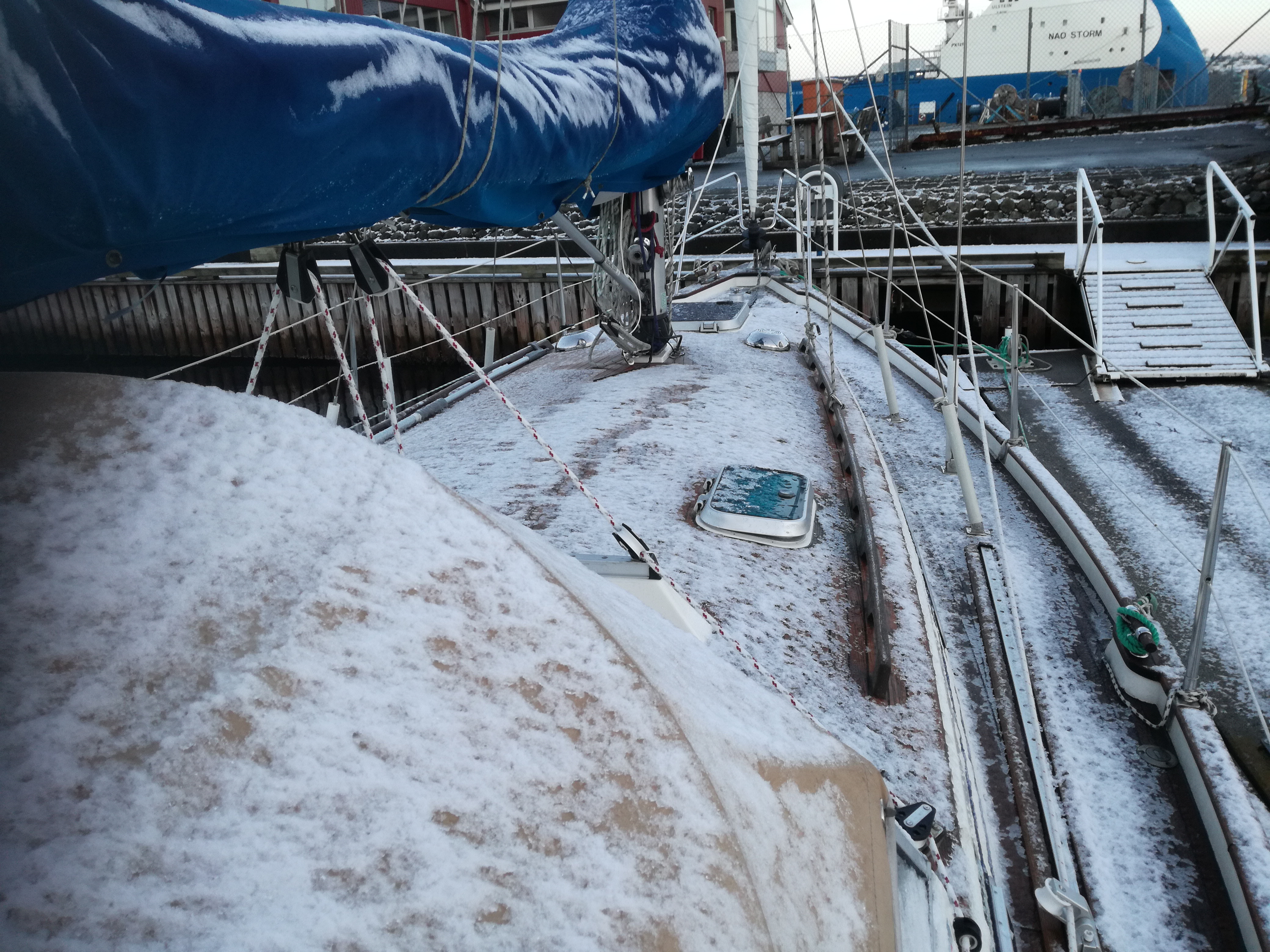 We stayed in town (Stavanger) for a few dayswhile I worked long days to finish an application for project funding. Tuesday morning I woke up to five degrees C in the cabin and snow and ice on deck. Beautiful morning though, too nice to be inside all day! I got electricity on board so next morning was a bit warmer. The old diesel heater is ok but I don’t want to run it at night.
