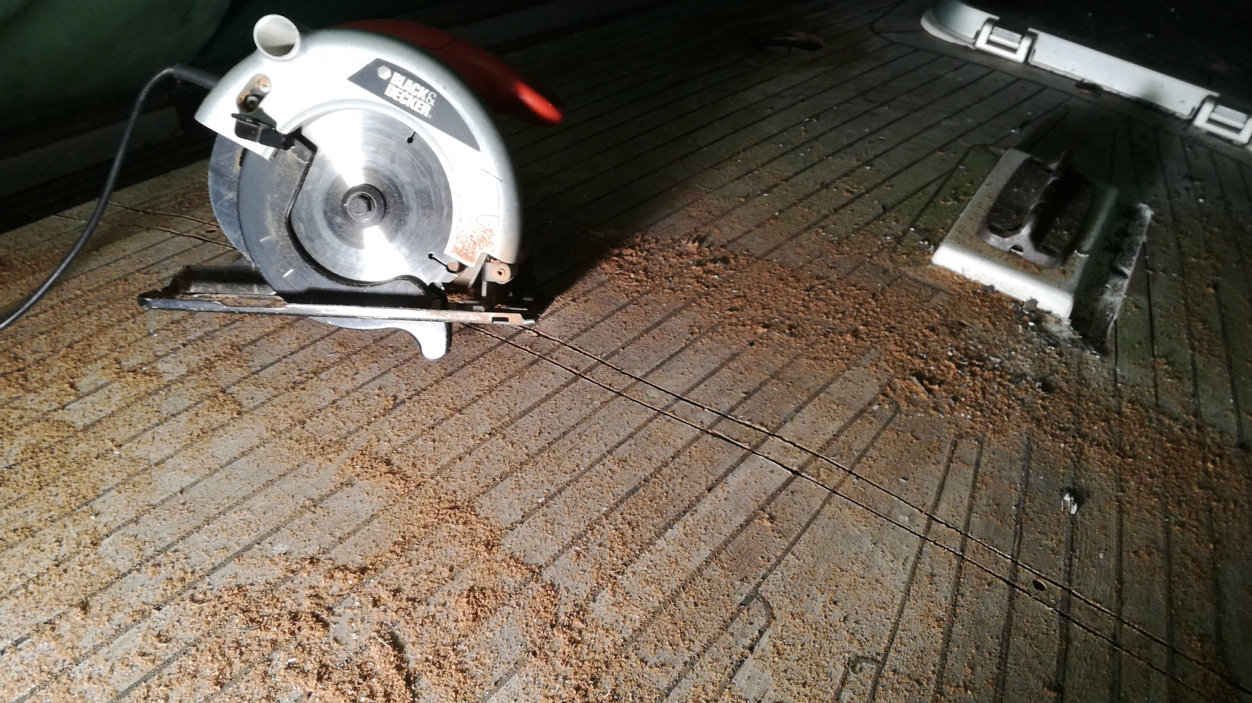 That proved to be a bigger job than I first thought! The Vindø yard did a very good job when they built these boats. It turned out that the teak was glued down with a very strong bonding. With the help of my two sons, we spent around ten hours between us just to remove the teak. We cut across with a circular saw, every 20 cm or so, and chiseled off every bit and piece. And still there was the job of cleaning off the glue.