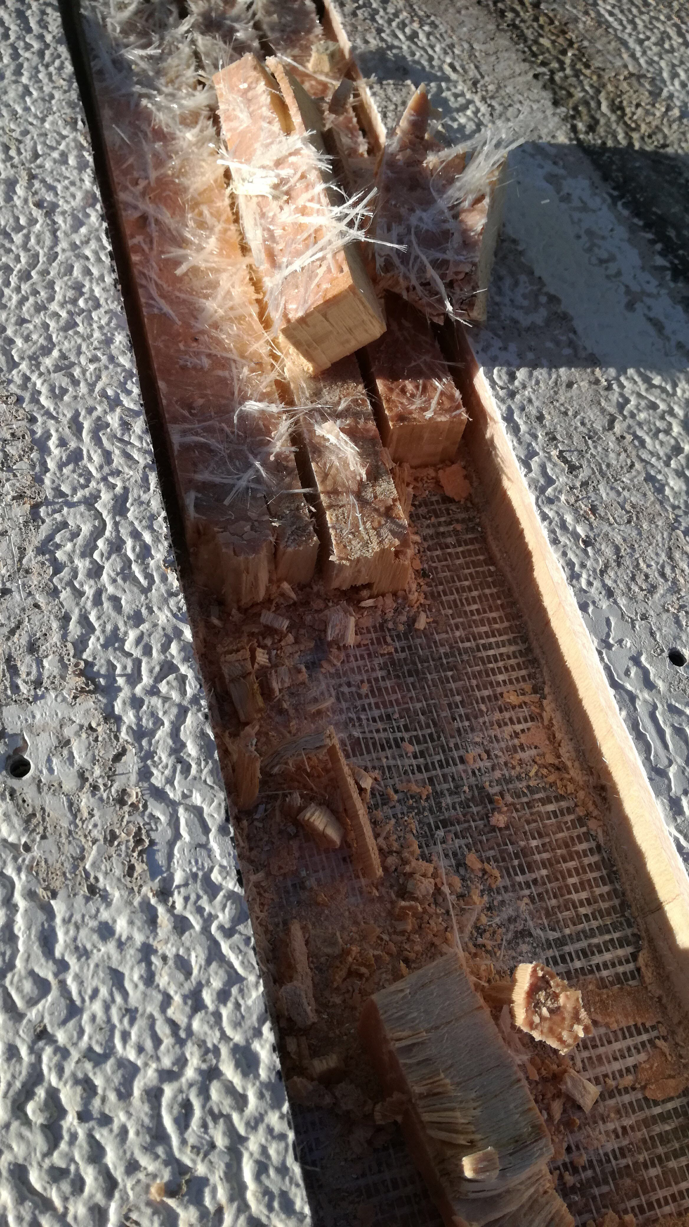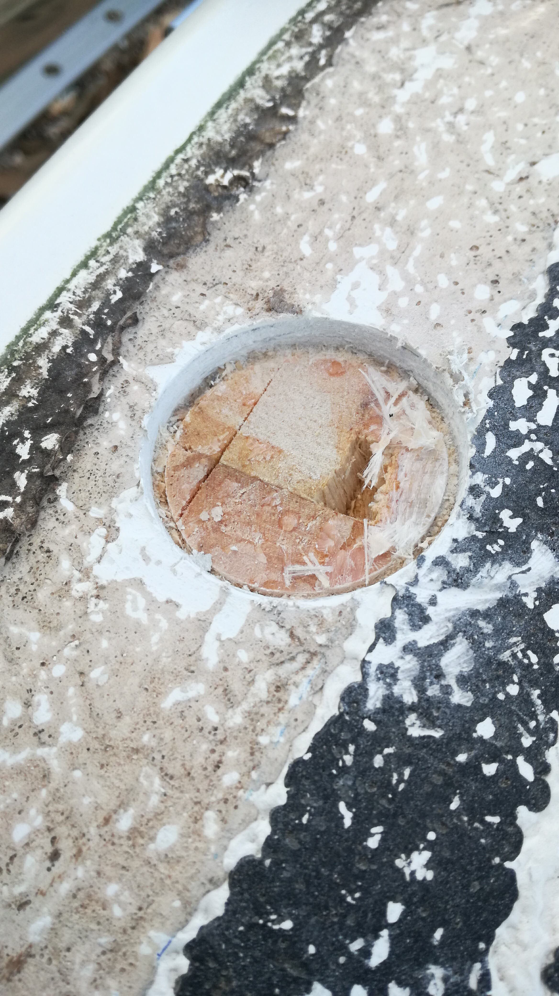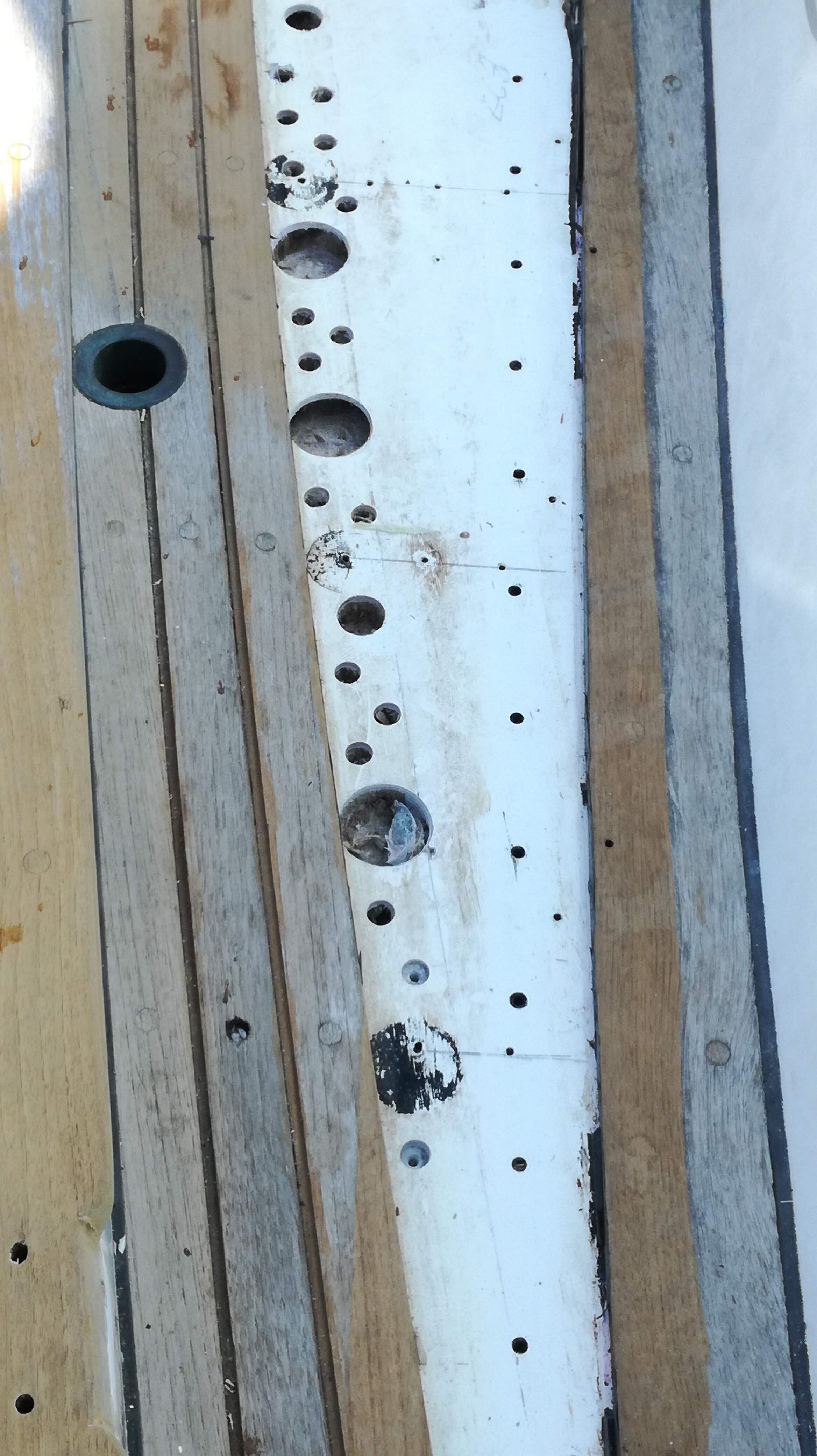 It turned out there was non skid pattern under the teak, but I had to sand the fiber glass to clean it properly, so I could not save the non skid. But what about the balsa? I cut out two slots, 6×60 cm, where I had planned to make fastenings for sheet tracks for a future smaller fore sail on an inner stay. At some other points I also cut out holes to get to the balsa. And would you believe it! It was bone dry! As if it had been put in last month. Freshly colored, crisp and light as balsa should be. Note the screw holes in the fiber glass.