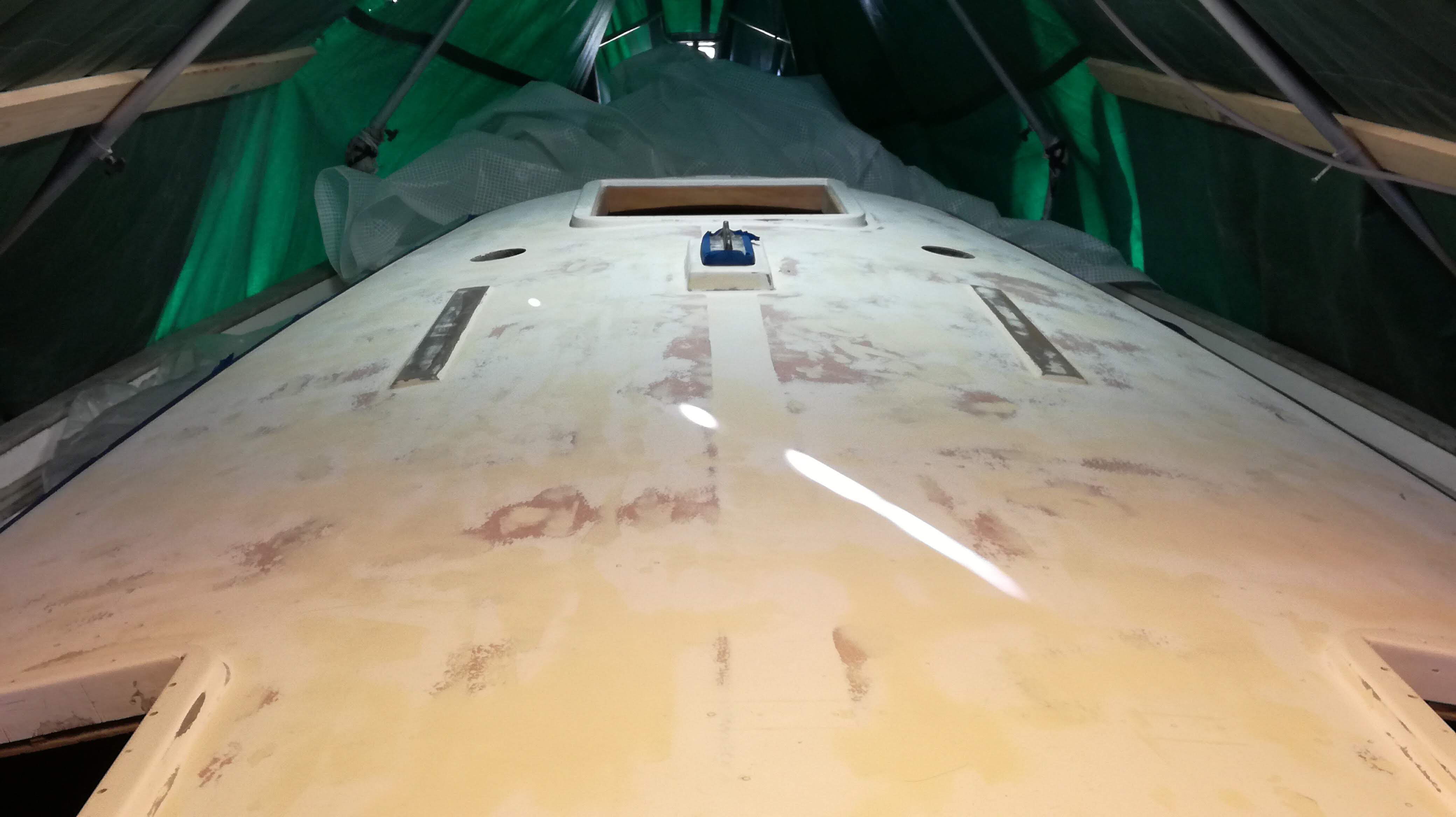 That was a relief! Now the job was rather stright forward: scrape off old glue, sand down, lay on epoxy filler, sand, more filler, sand. Finally I rolled on a coat of epoxy, before a coat of primer and two coats of polyurethane paint (the paint was put on after the boat was back on the water). Note the fastenings for the sheet tracks. They are teak, glued down with epoxy, covered with glass mat and epoxy.