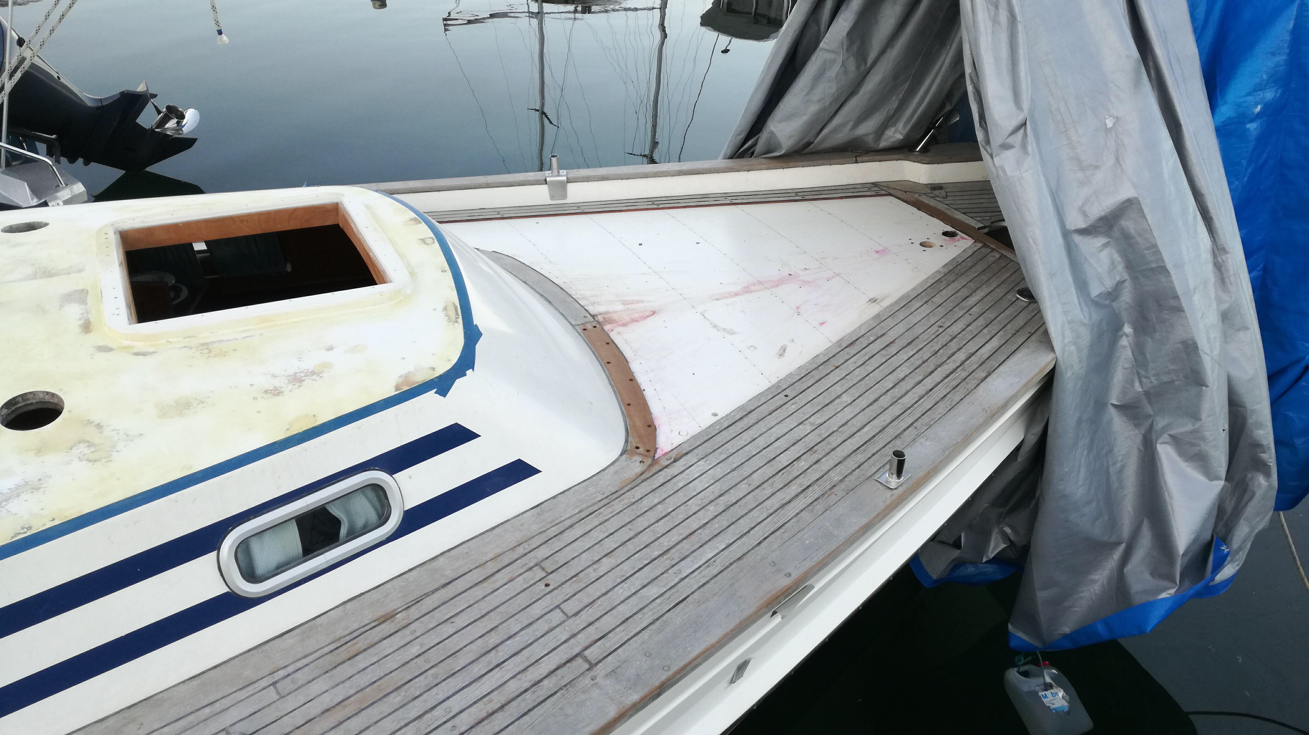 I was confident I would find out what to do, I just needed some time and to do some checks. I knew that the deck is built up by two layers of five millimetres of fiberglass with fifteen millimetres of balsa in between. The teak is fastened with screws that go through the upper layer. Around 700 screws on the coach roof alone. Everybody who has an opinion about it, or experience with such decks, say that there is guaranteed to be moisture in the balsa wood.