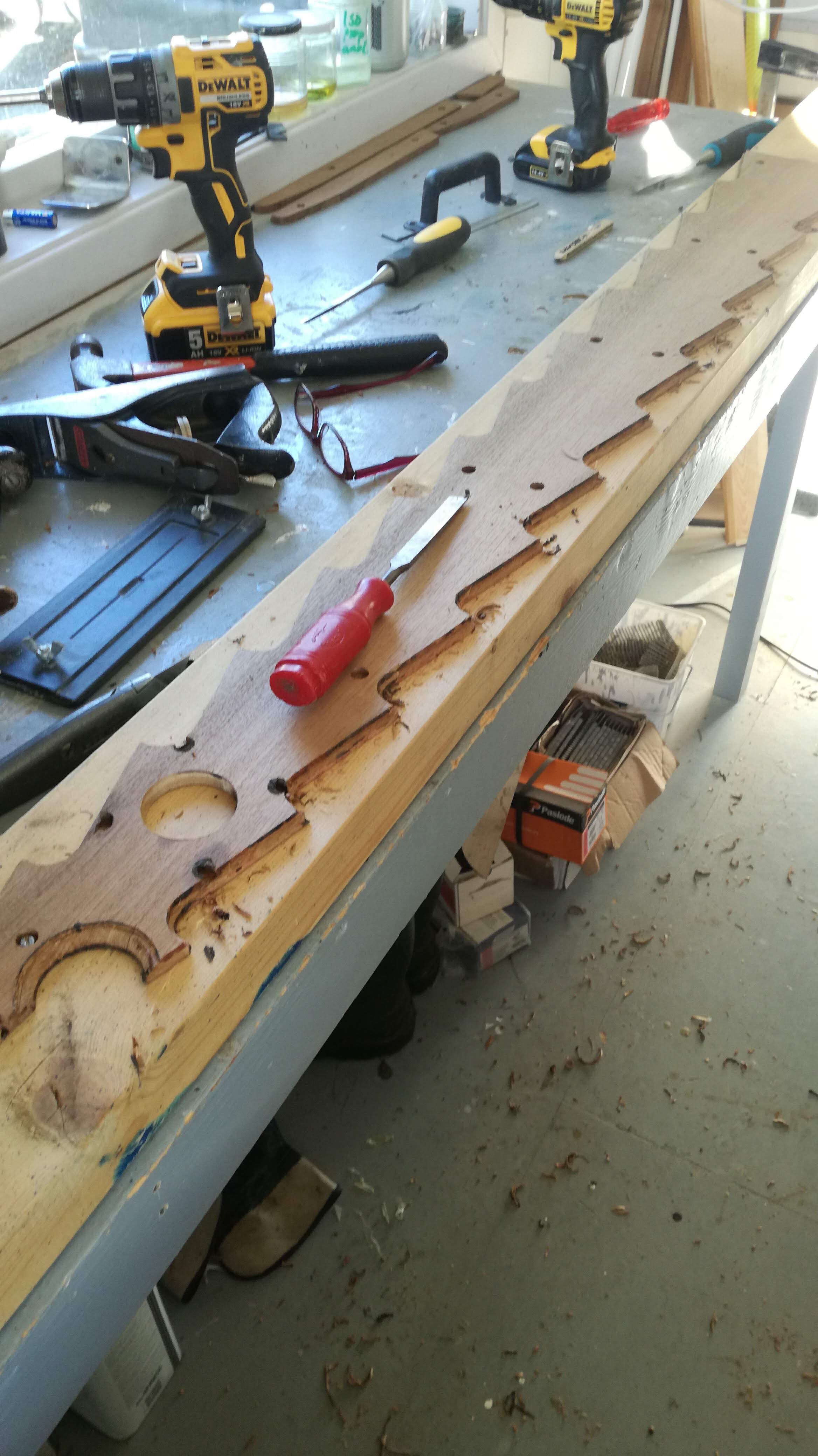 I found that there was 8-10 mm of teak left on the roof, so it should be enough to sand down. But the problem was the caulking seams. I tried to refreshen them and make them deeper, both with a router and with a sharp knife, but it was difficult not to damage the teak. I made my decision: off with it!