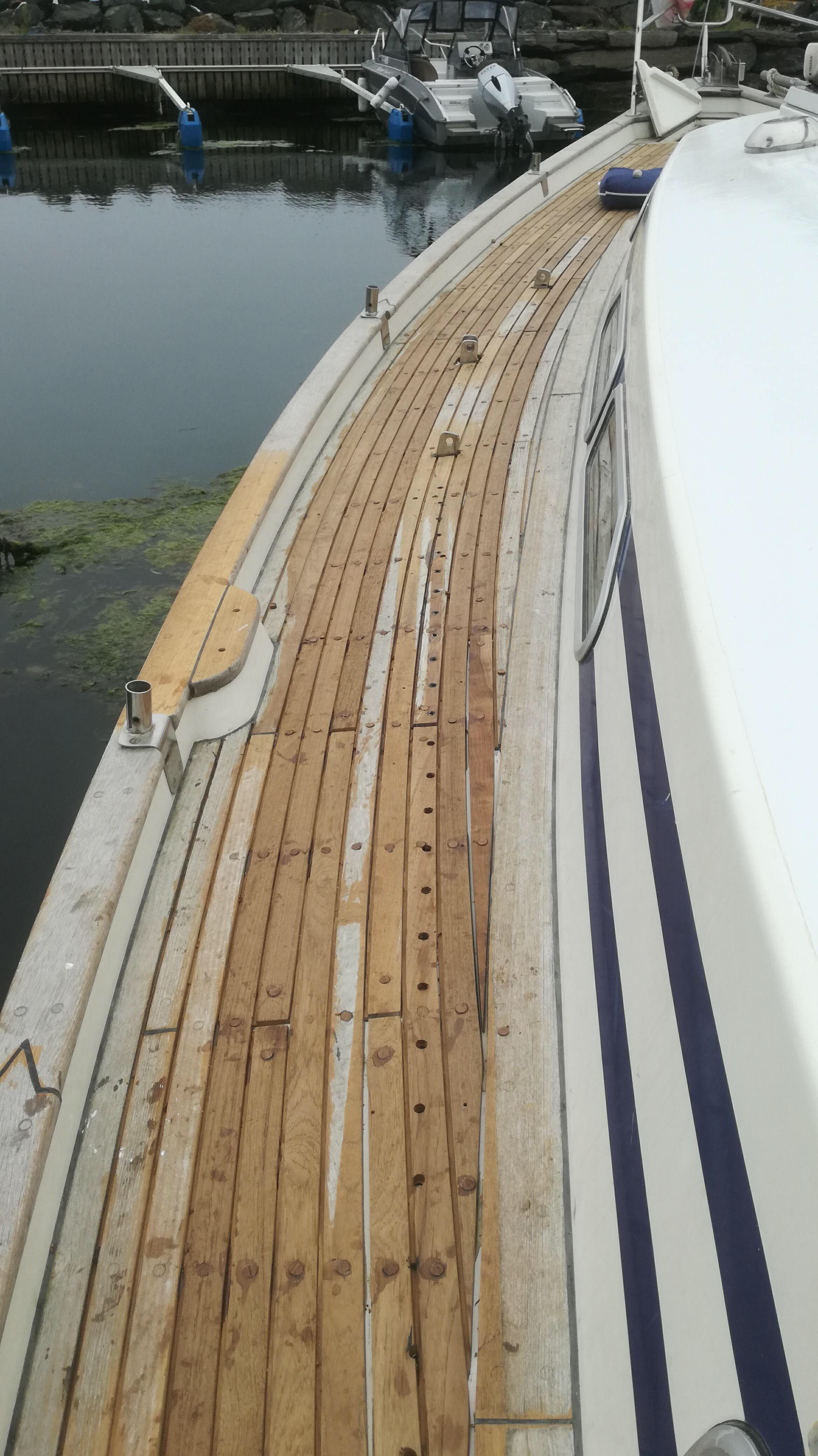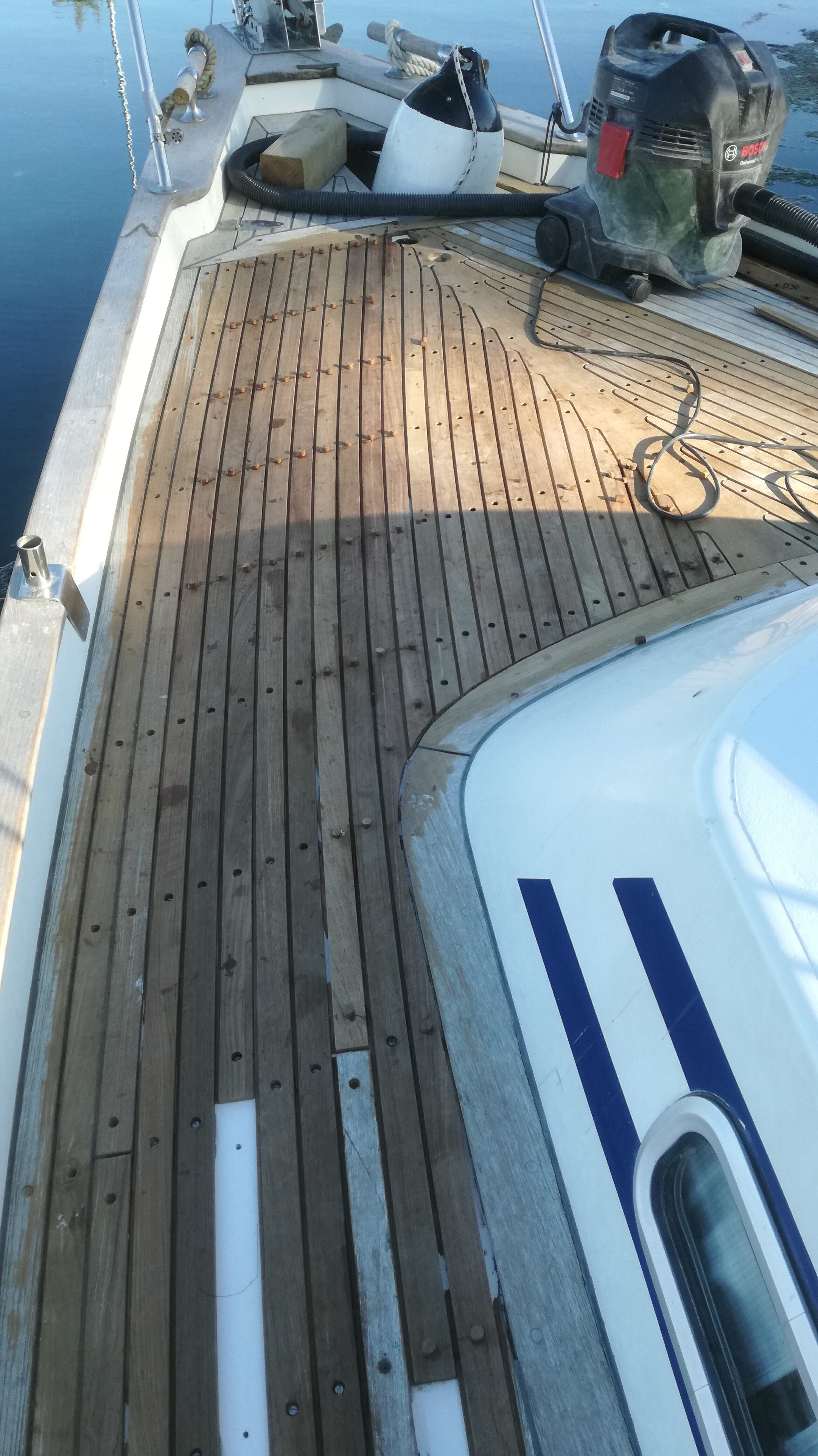 I consulted several YouTube-channels, talked to people with knowledge and skills, and read books and articles. There could be several solutions to renovate the decks. I could tear off all the teak, getting down to the fiber glass underneath, seal all the screw holes, smooth the surface and put on non skid paint. This would give nice, clean decks, easy to keep, and could also be nice to look at. Laying new teak was not an option. One thing would be the price, or the amount of work if I should do it myself. Another thing was the environment issue, using timber that probably would come from rain forests that need to be protected. Yes, there is sustainable production of teak, but this may not be of the same quality, and the international trade in this kind of timber is likely to be difficult to trace anyway.