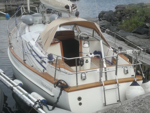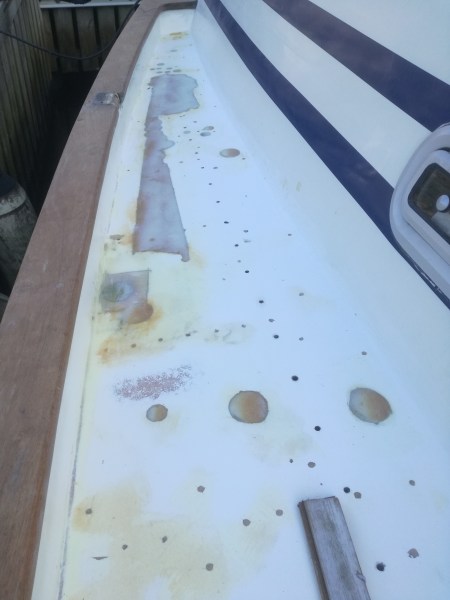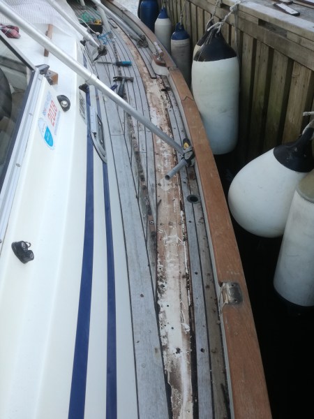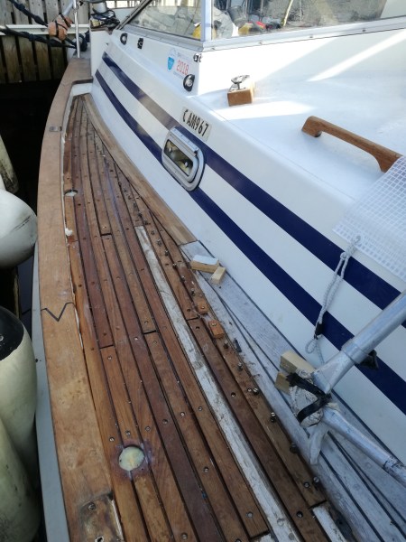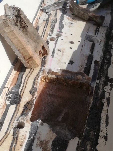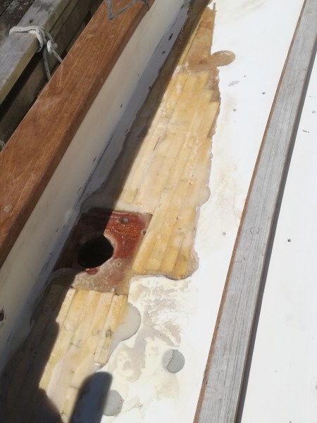 Removing the stanchion bases was much easier than putting them back on!Ready to continue in March.Removing teak. The good thing with dry weather (for boat maintenace) is that it doesn’t rain. On the other hand, it normally means very low water. A bit awkward to work from the quay then!Planing and cleaning the teakThe deck is built up of a 7 mm layer of fiber glass, then 15 mm balsa wood, another 7 mm of fiberglass, and on top of that, the teak. The teak is fastened with thousand screws through the upper layer of fiberglass. A sure source of moisture into the balsa. On this boat, almost the whole deck was dry in the middle layer, only a small spot on the port side, and some more on the starboard side, had this problem. I cut out the upper layer of fiberglass and dug out the wet balsa.The rest of the balsa is good (I checked by drilling holes). The voids had to be filled, covered with new mat and epoxy, sanded, filled, sanded again, and the teak glued back on. The following pictures show the process. Also, there was a leak around the filling pipe for the water tank, and the drain. That is now sealed.