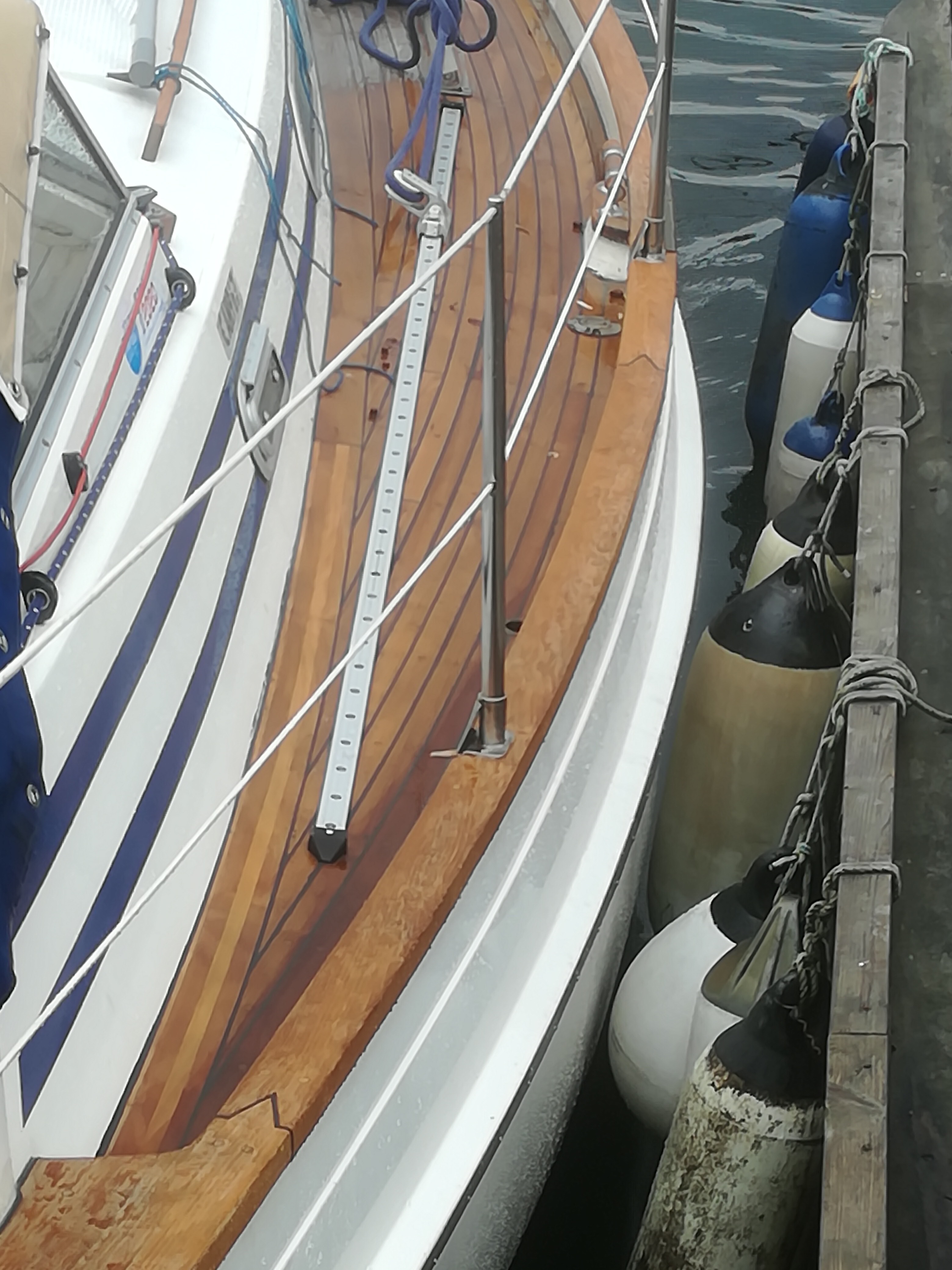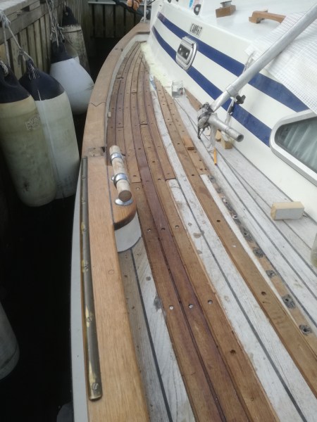 Stanchion bases back on. As I said … And new teak pins for the cleats were turned. The rail is oiled with Hempel teak oil. The deck is just washed lightly when needed and rinsed with sea water. There is still some general cleaning and polishing to do, but other than that, she is ready for the summer!