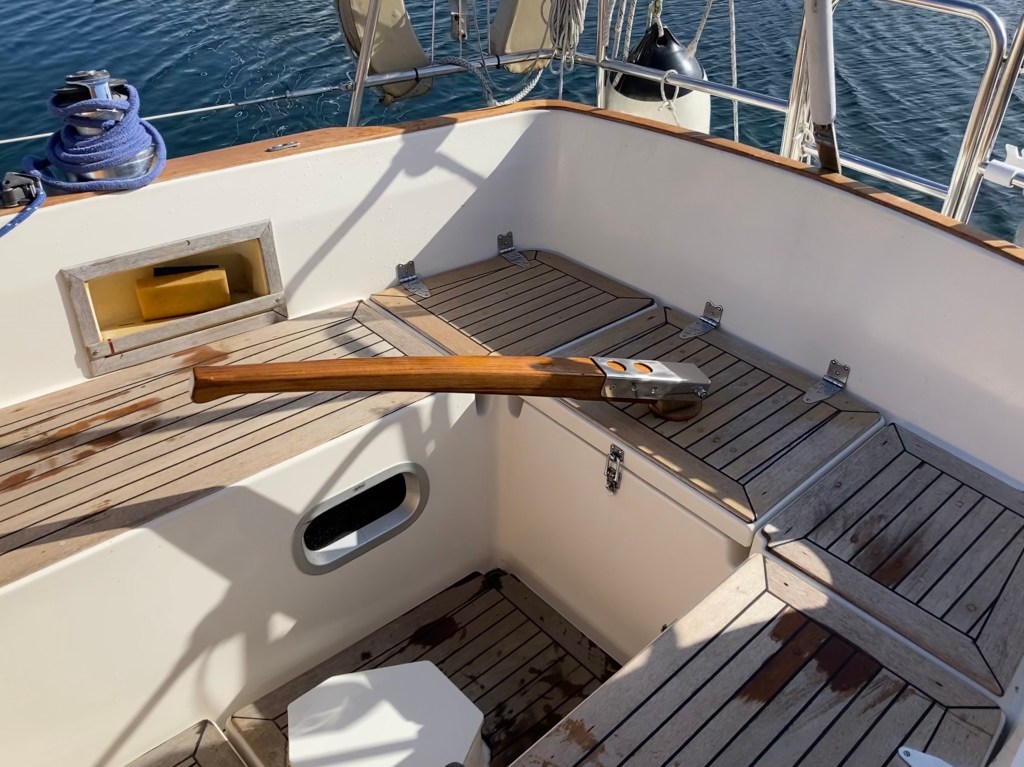 The cons? I had to find a new place for the engine control, which now is a bit too low down. And the compass and the chart plotter, but it will be solved. Going in reverse, you feel the force directly in your hand and have to hold the tiller firmly to keep control. A bigger drawback is that it meant blocking the aft locker lid. I can reach into it from the opening to starboard, but the extended rudder shaft has taken up some of the room in the middle. This was a roomy locker, so I have lost some storage. If I still want to have an auto pilot, I either have to get a new drive unit that goes directly on the rudder shaft, or get a tiller pilot. The first option would be the best, but definitely the most expensive. I will see. The boat tracks very well without the autopilot when the sails are set well. And with the tiller, I have a good feel of the balance.