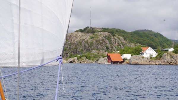 We took two hour watches through the night. When I came up at five in the morning the sea was calmer and the wind just fine. We sailed on past Tananger, rounding Tungenes as the sun broke through. From there we had a nice, easy sail with the wind behind us. It was a relief to stop the engine after fifteen hours continous running and just feel the wind and the sun as we slowly made our way between the islands.