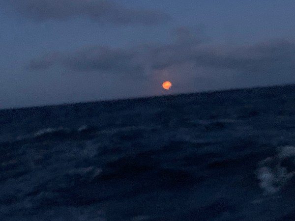 Half past ten the full moon came up in the south east, and now and then lit up the sea through the darkest part of the night. It made a good companion, hiding and appearing again behind the clouds. No rain, just dry breeze, warm in the beginning, but as the night wore on, we had to put on more layers of wool and wind proof clothes.