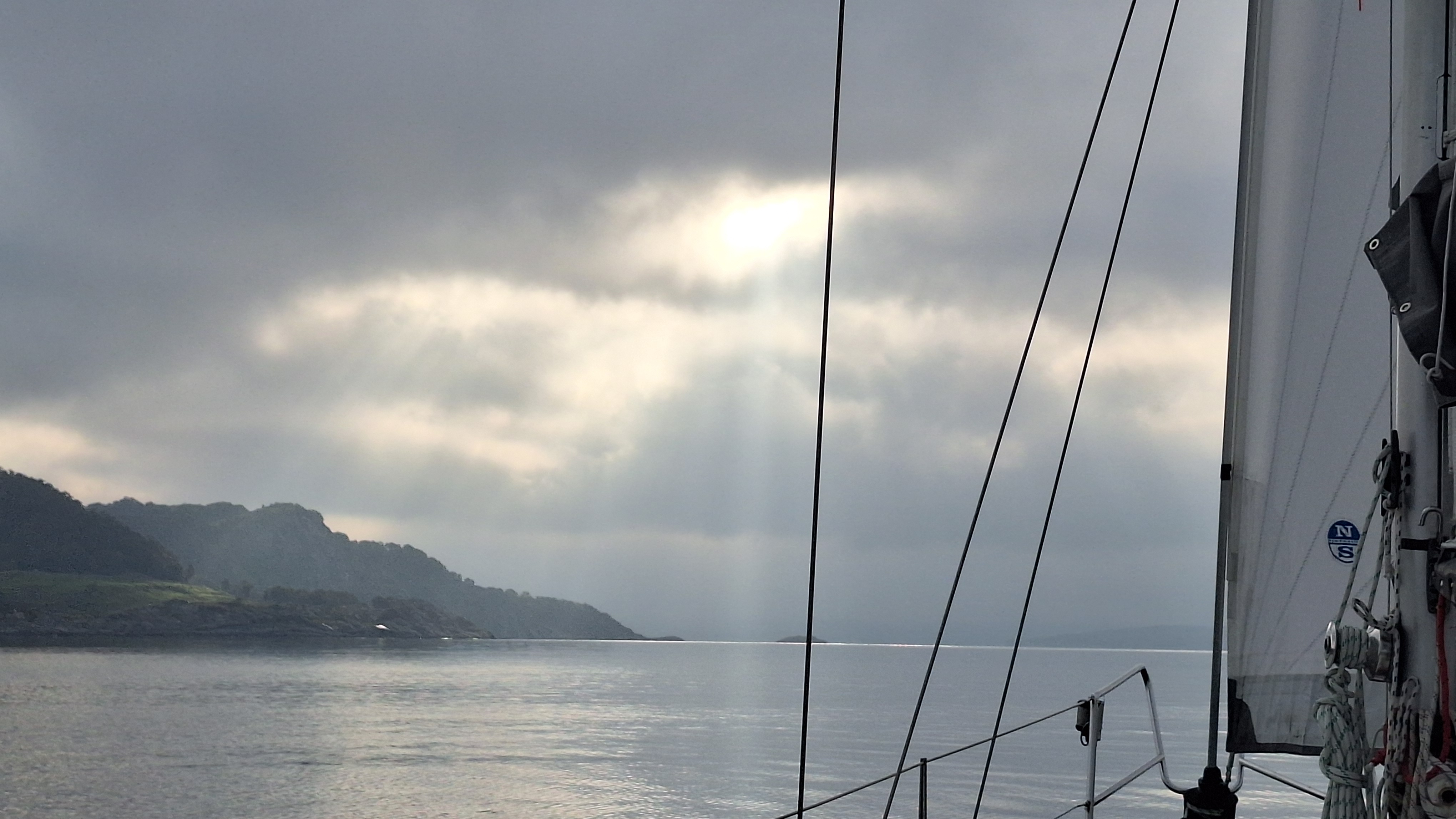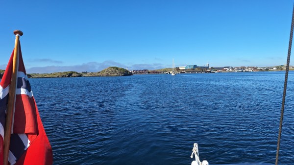 In the middle of the night a thick fog came in, but Sunday morning it had lifted, only a thin mist remained. There was no wind for sailing, so the last leg home was by engine. A beautiful cutter was anchored just around the corner. Its home port is just across the fjord from us. The owner is 87, and still sails. So I should have another twenty years to sail! I met him in Shetland in July, together with his son.